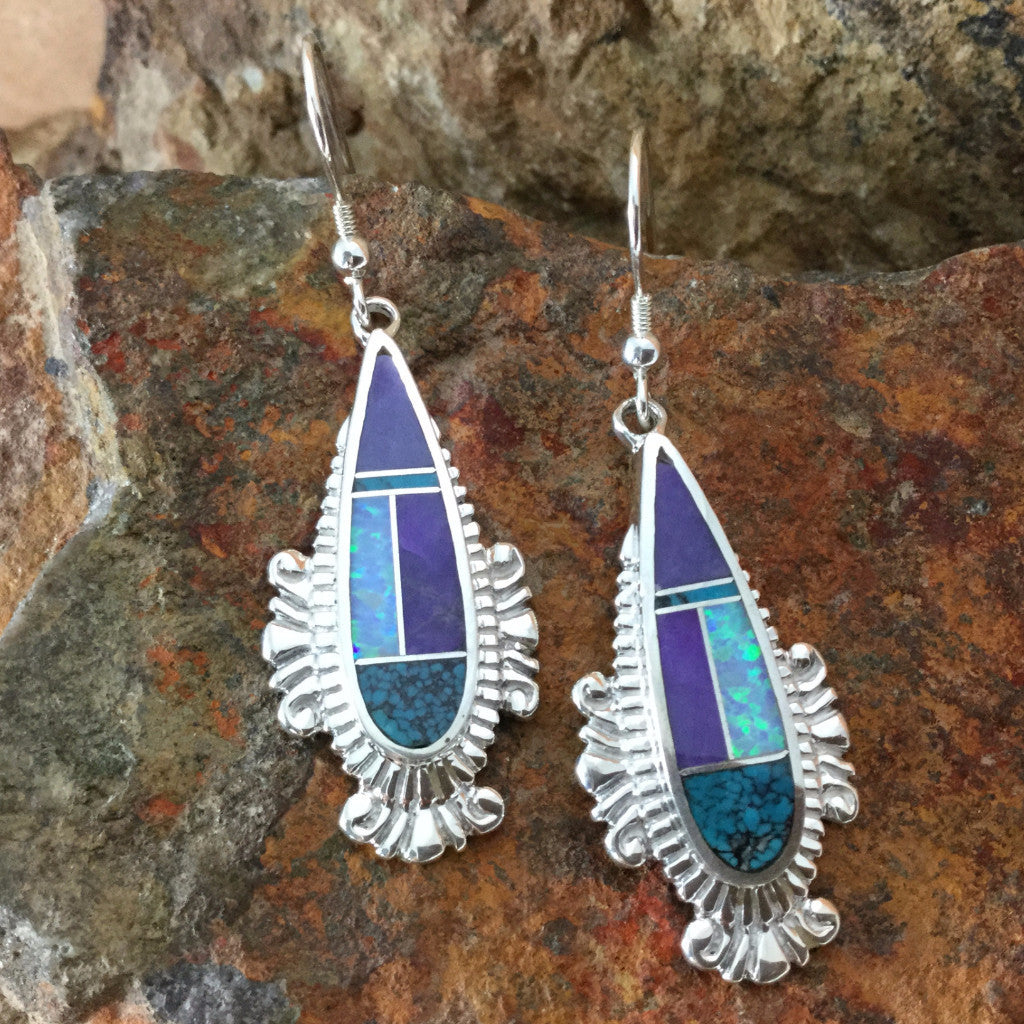 These gorgeous Sterling Silver Earrings, shown from the Shalako Collection features Sugilite, Tibetan Turquoise and Lab Opal.