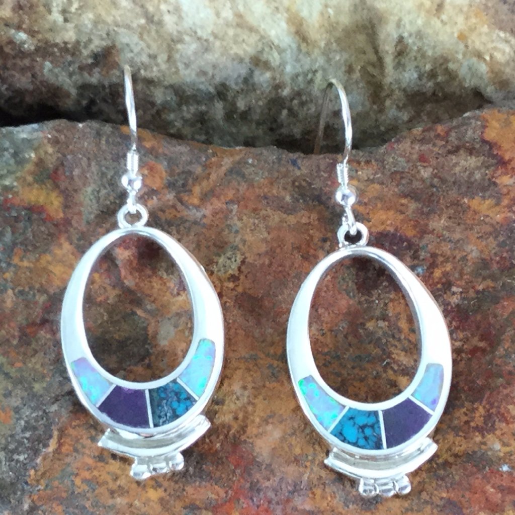 These gorgeous Sterling Silver Earrings, as part of the Shalako Collection, featuring Sugilite, Tibetan Turquoise and Lab Opal.