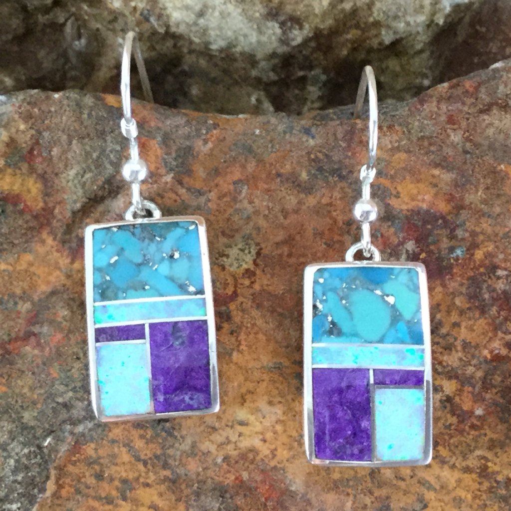 These gorgeous Sterling Silver Earrings, as part of the Shalako Collection, feature Sugilite, Tibetan Turquoise and Lab Opal.