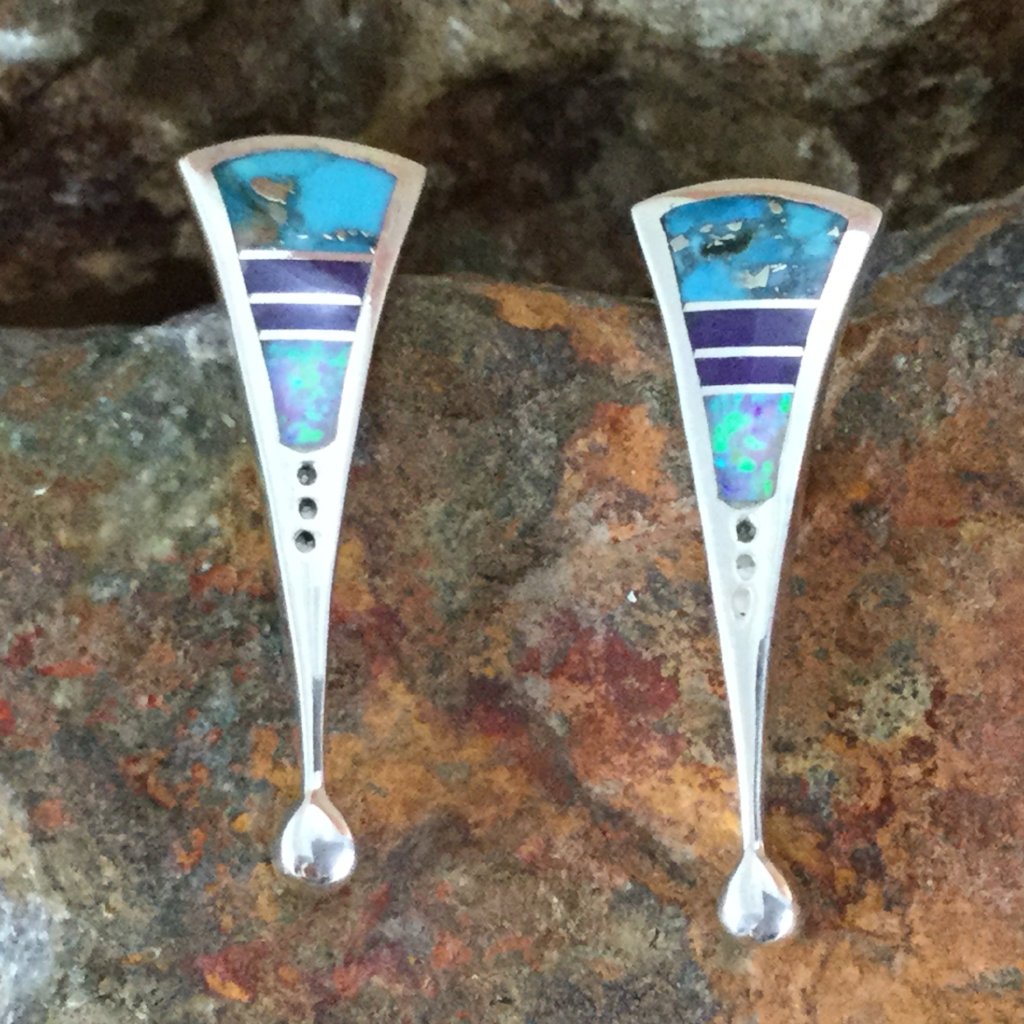 These gorgeous Sterling Silver Earrings, as part of the Shalako Collection, feature Sugilite, Tibetan Turquoise and Lab Opal.