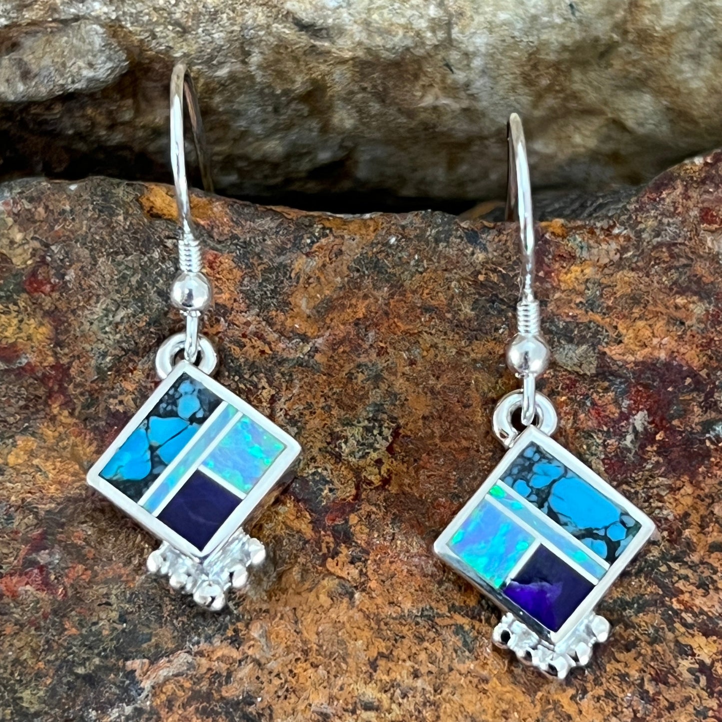 These gorgeous Sterling Silver Earrings, as part of the Shalako Collection which feature Sugilite, Tibetan Turquoise and Lab Opal.