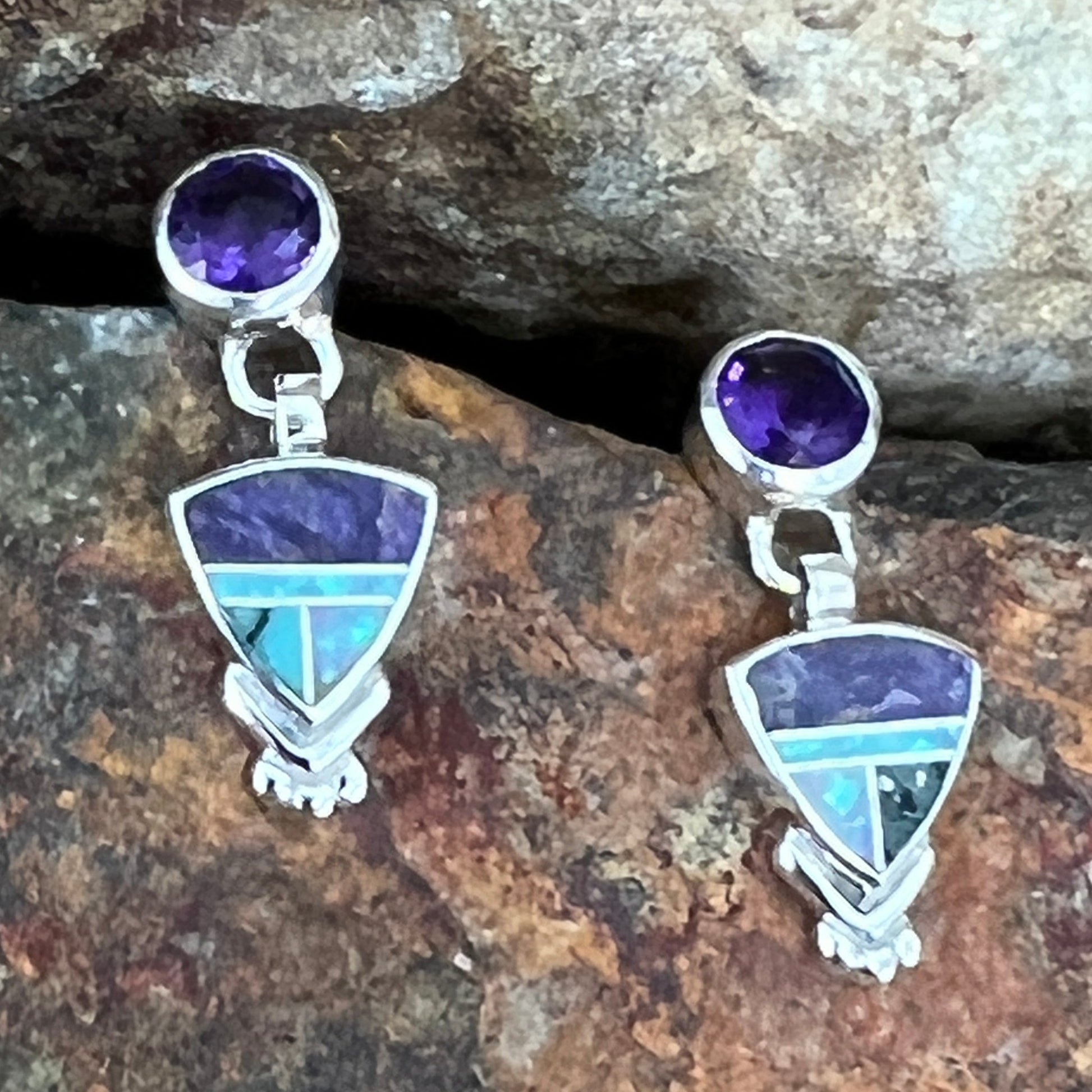 These gorgeous Sterling Silver Earrings, as part of the Shalako Collection, feature Sugilite, Tibetan Turquoise and Lab Opal with Amethyst.