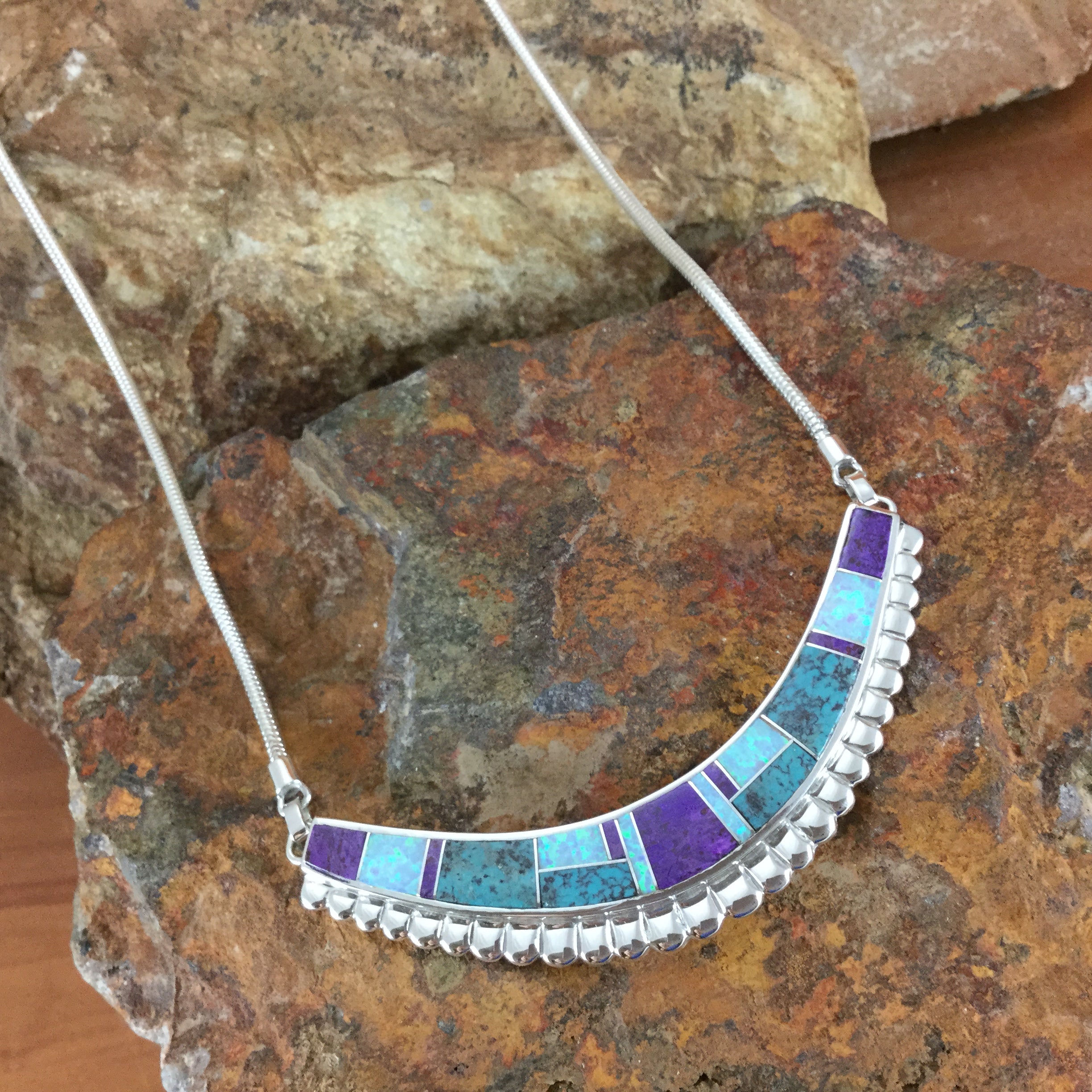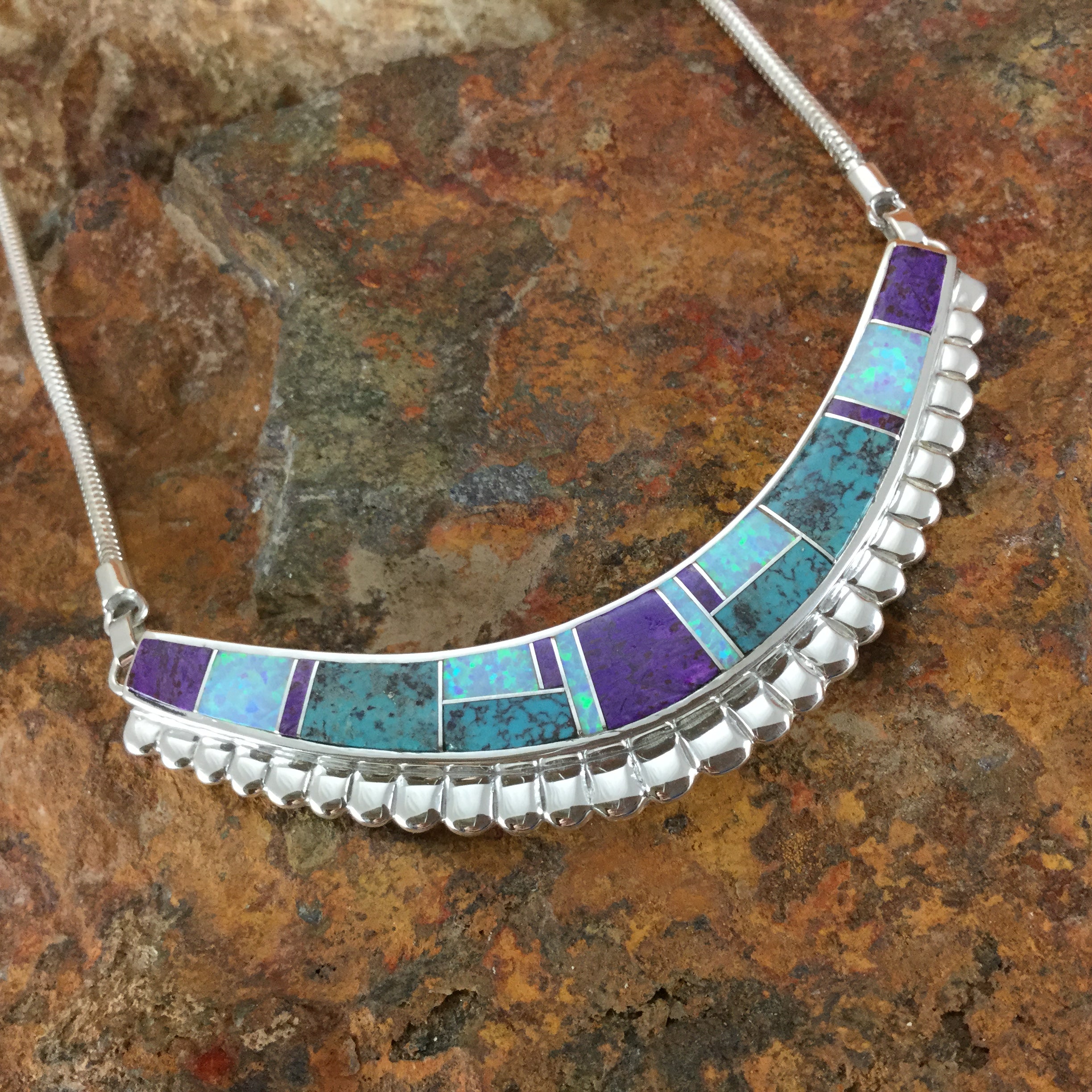 This gorgeous Sterling Silver Necklace with chain, as part of the Shalako Collection features Sugilite, Tibetan Turquoise and Lap Opal.