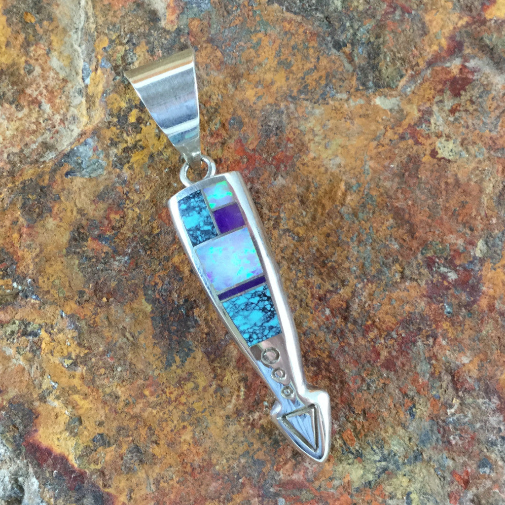 This beautiful Sterling Silver Pendant, as part of the Shalako Collection features Sugilite, Tibetan Turquoise and Lab Opal.