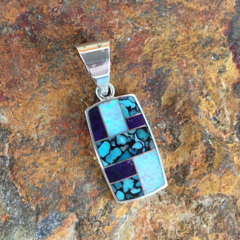This beautiful Sterling Silver Pendant, as part of the Shalako Collection features an Inlay pattern of Sugilite, Tibetan Turquoise and Lab Opal.
