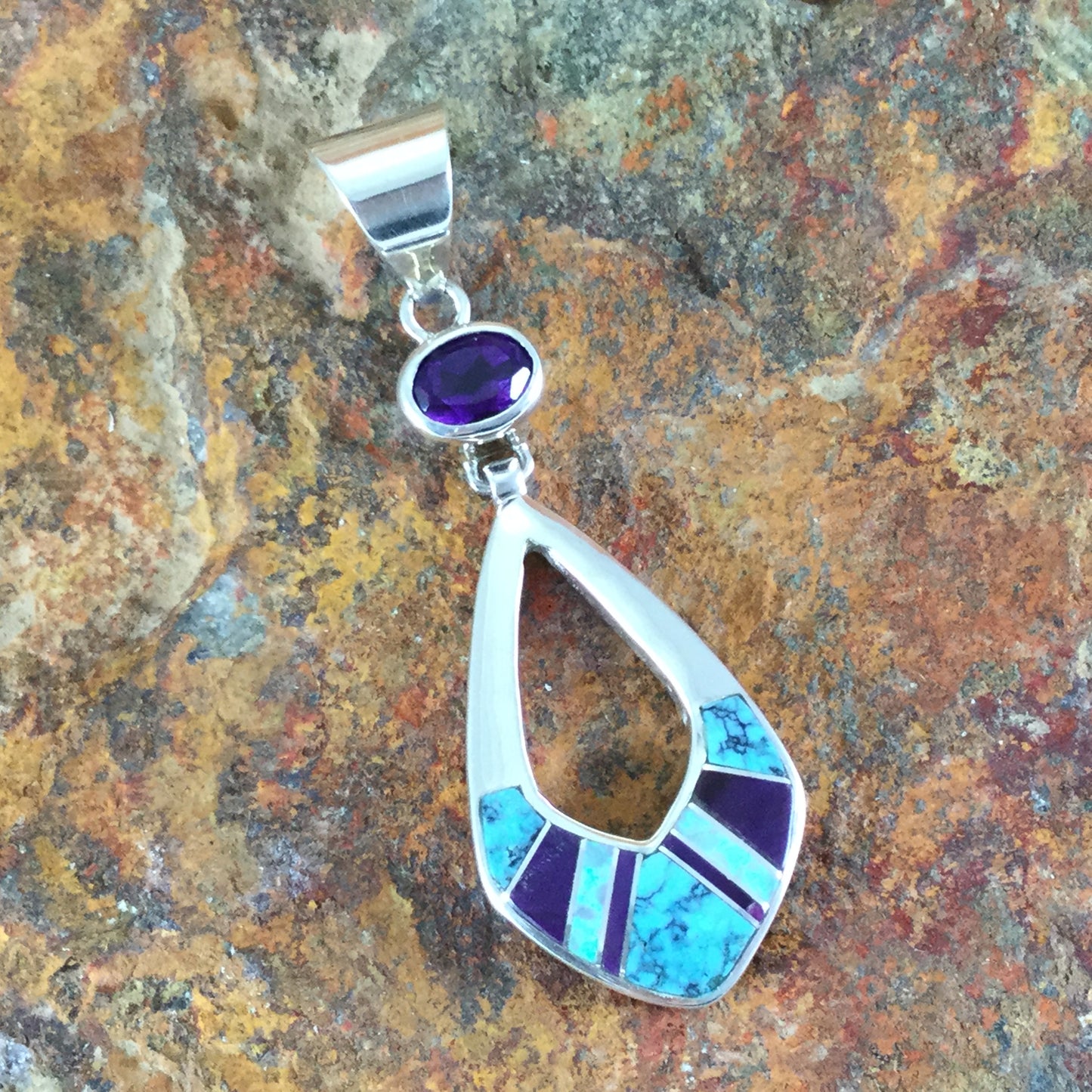 This beautiful Sterling Silver Pendant, as part of the Shalako Collection features a Fancy Inlay pattern of Sugilite, Tibetan Turquoise and Lab Opal with Amethyst.