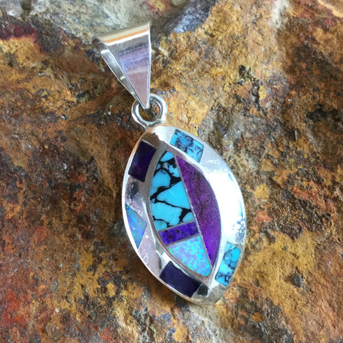 This beautiful Sterling Silver Pendant, as part of the Shalako Collection features Sugilite, Campitos Turquoise and Lab Opal.