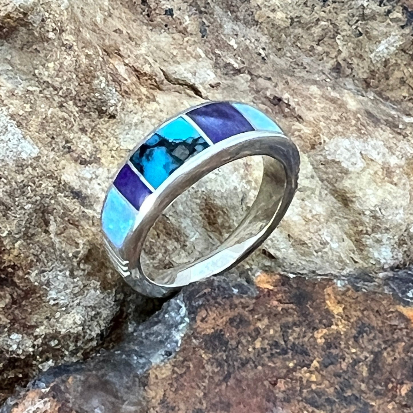 This beautiful Sterling Silver Ring, as part of the Shalako Collection, features Sugilite, Tibetan Turquoise and Cultured Opal.