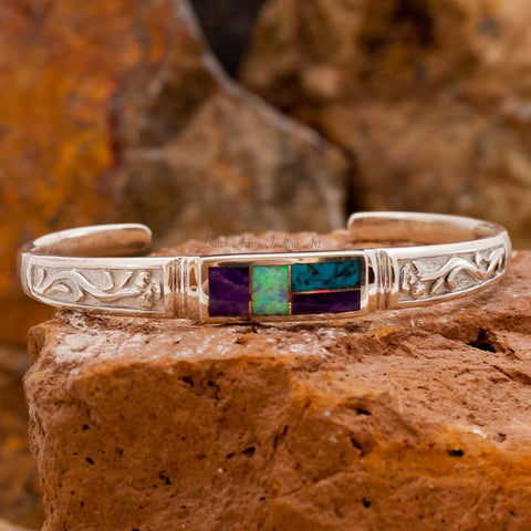 This Beautiful Sterling Silver Bracelet shown in the Shalako Collection, features Sugilite, Tibetan Turquoise and Lab Opal. Choose Bracelet Size based on Total Circumference of Wrist.