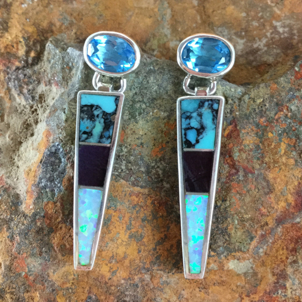 These gorgeous Sterling Silver Earrings, shown from the Shalako Collection features Sugilite, Tibetan Turquoise, Lab Opal and Blue Topaz Gemstone.