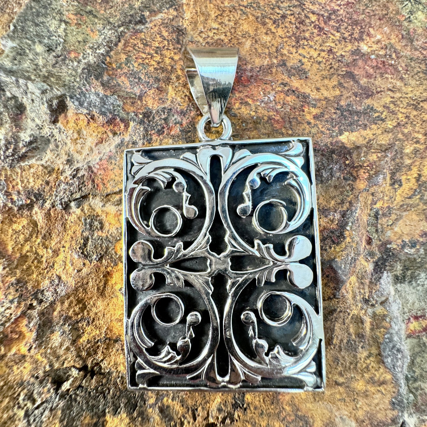 This beautiful Sterling Silver Pendant is part of David Rosales' Silver Country collection. It is set in a highly detailed polished Sterling Silver pattern on an oxidized etched background.