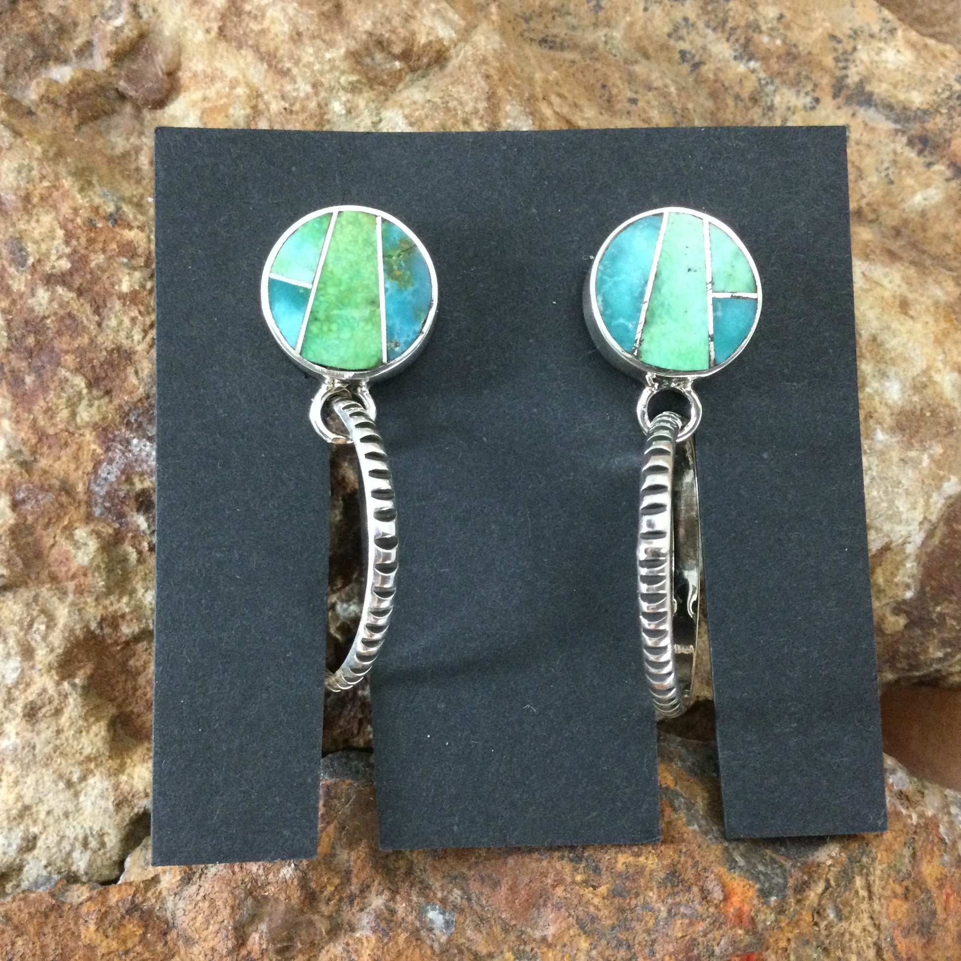 These gorgeous Sterling Silver Earrings showcase the spectacular Green, Blue and Yellow hues of Sonoran Gold Turquoise from Mexico with a Sterling Silver Hoop.