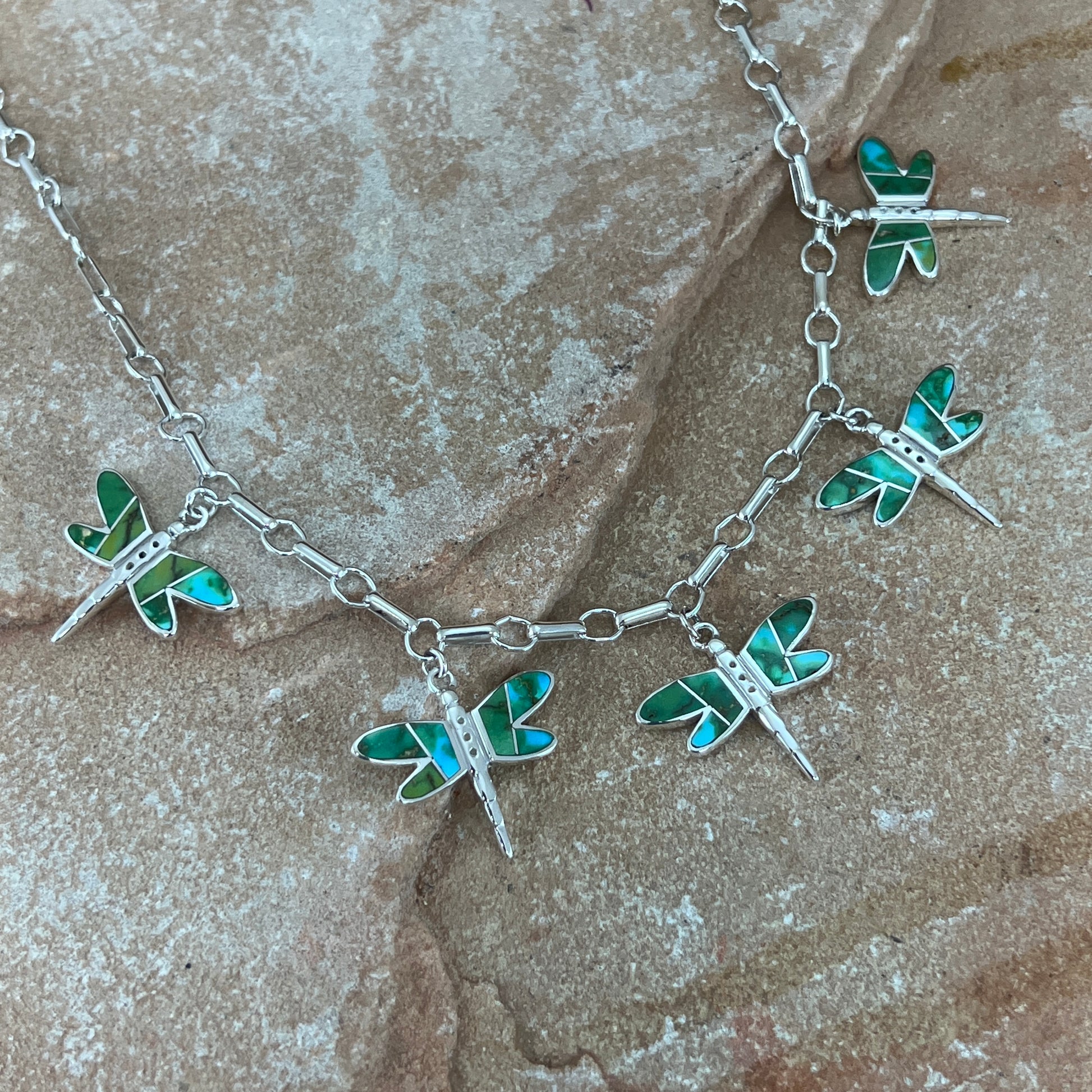 This gorgeous Sterling Silver Necklace with Dragonflies showcases the spectacular Green, Blue and Yellow hues of Sonoran Gold Turquoise from Mexico. Shown with matching Earrings SSER800 @ $264.00