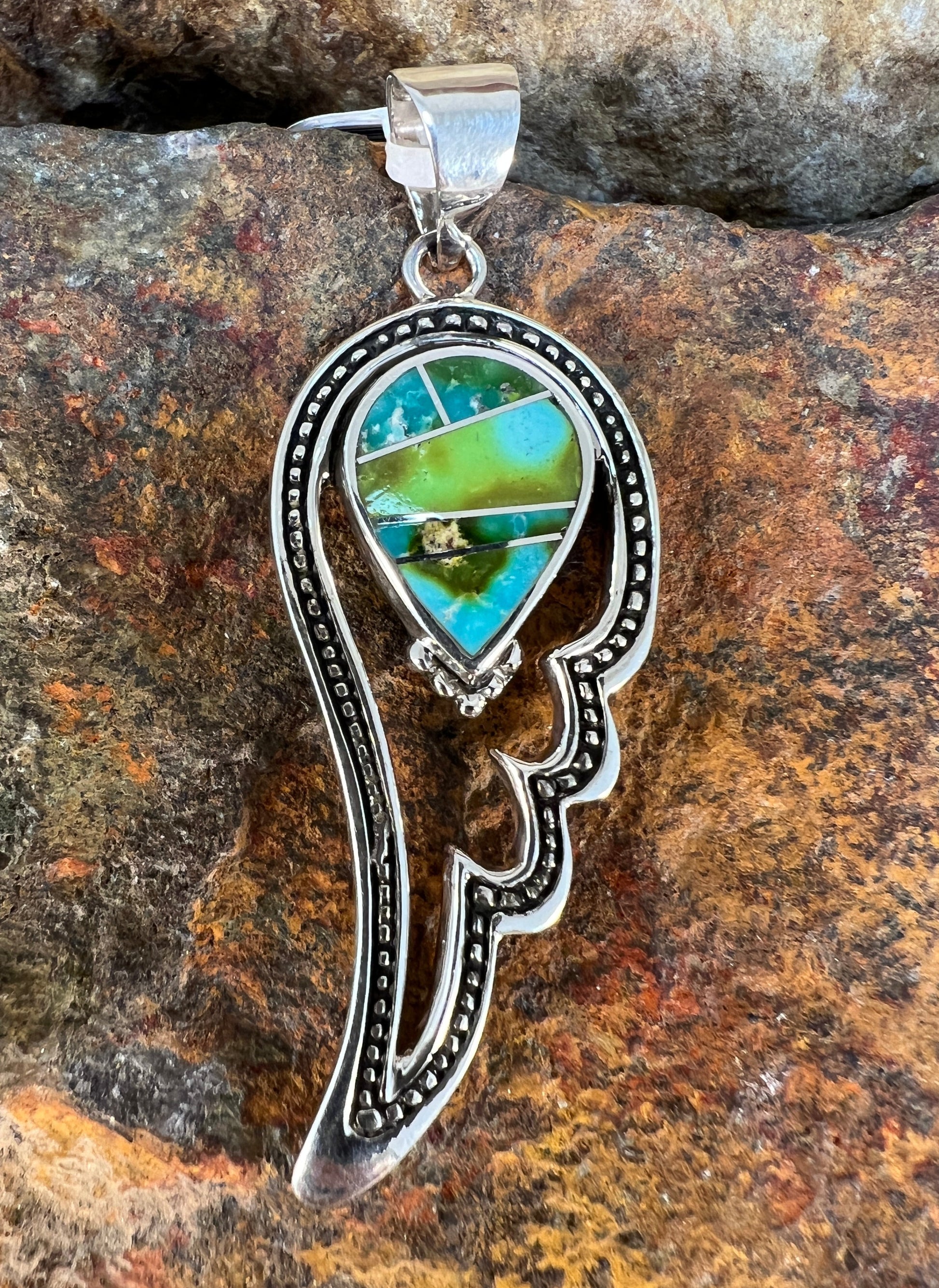 This Beautiful Sterling Silver Pendant features the spectacular Green, Blue and Yellow hues of Sonoran Gold Turquoise from Mexico