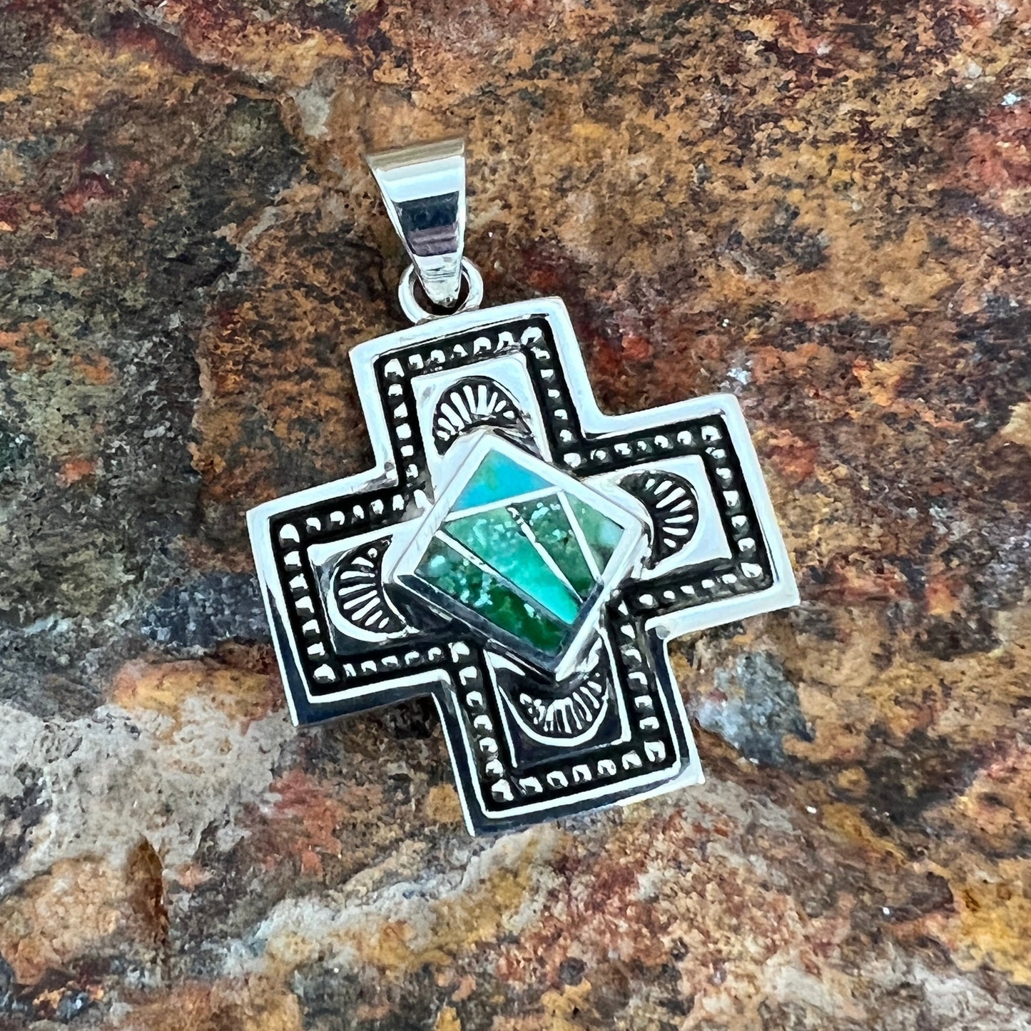This beautiful Sterling Silver Pendant Cross features the spectacular Green, Blue and Yellow hues of Sonoran Gold Turquoise from Mexico.