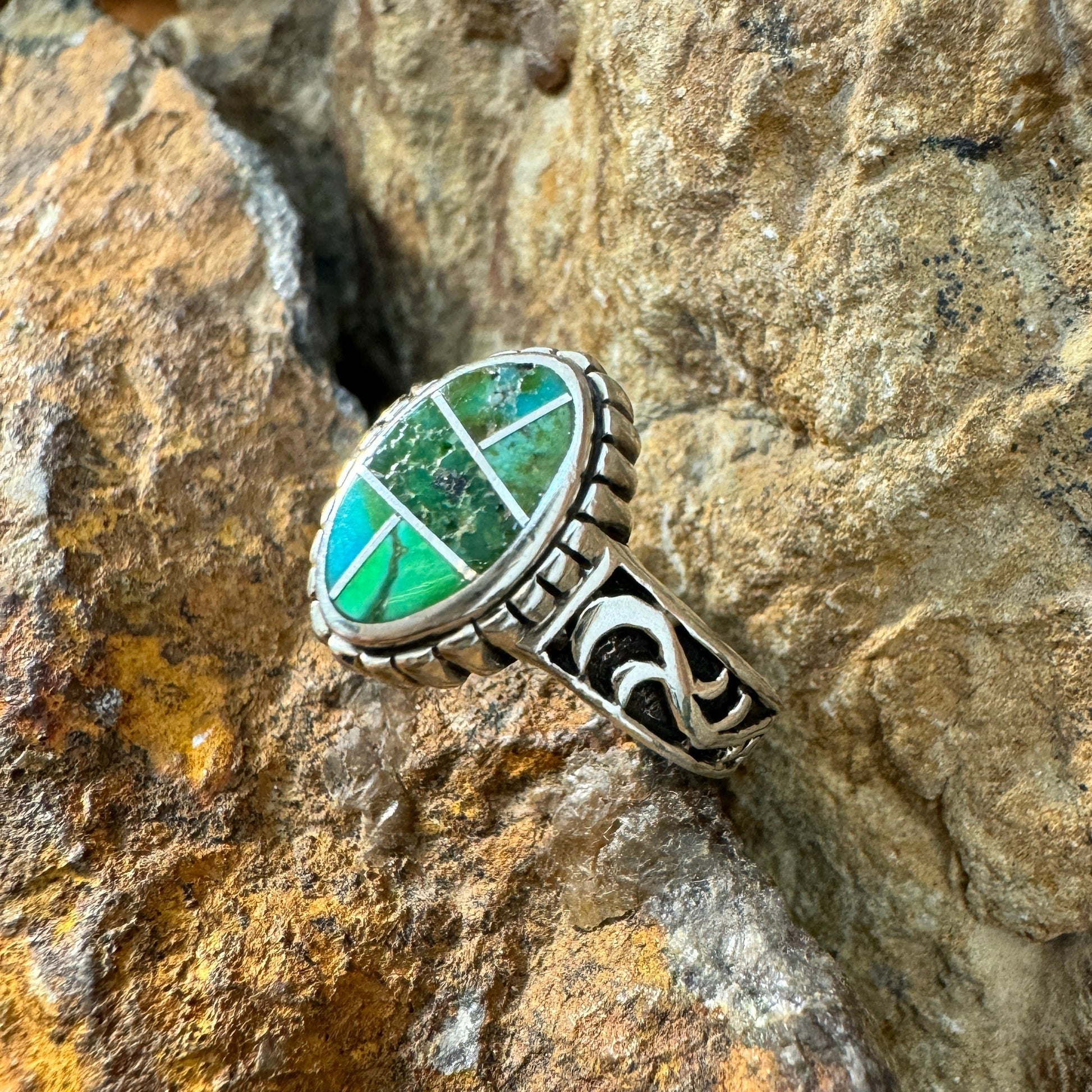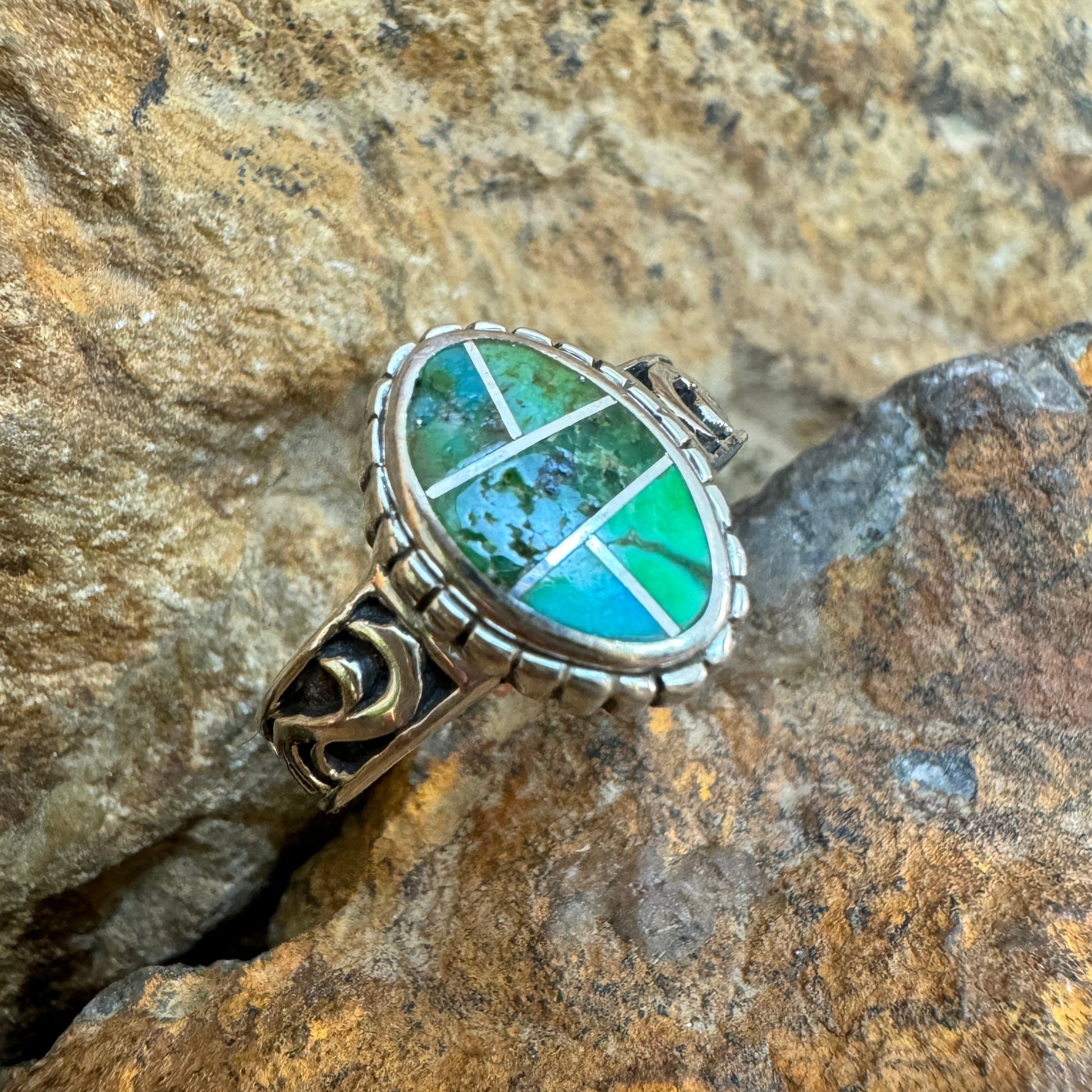 This beautiful Sterling Silver Ring showcases the spectacular Green, Blue and Yellow hues of Sonoran Gold Turquoise from Mexico.