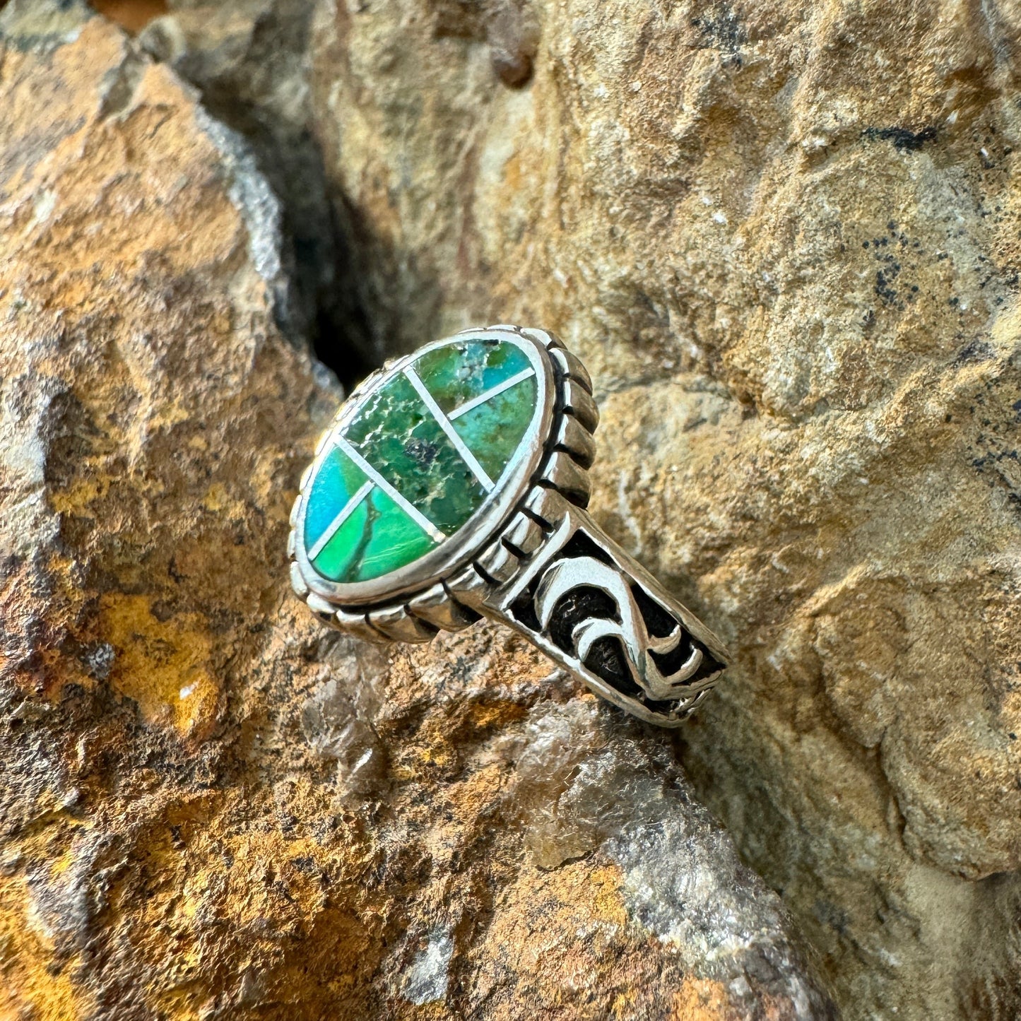 The ring is designed by David Rosales, one of the finest contemporary Southwest Artists in the world. He is the founder and co-owner of Supersmiths, Inc. of Gallup, NM.
