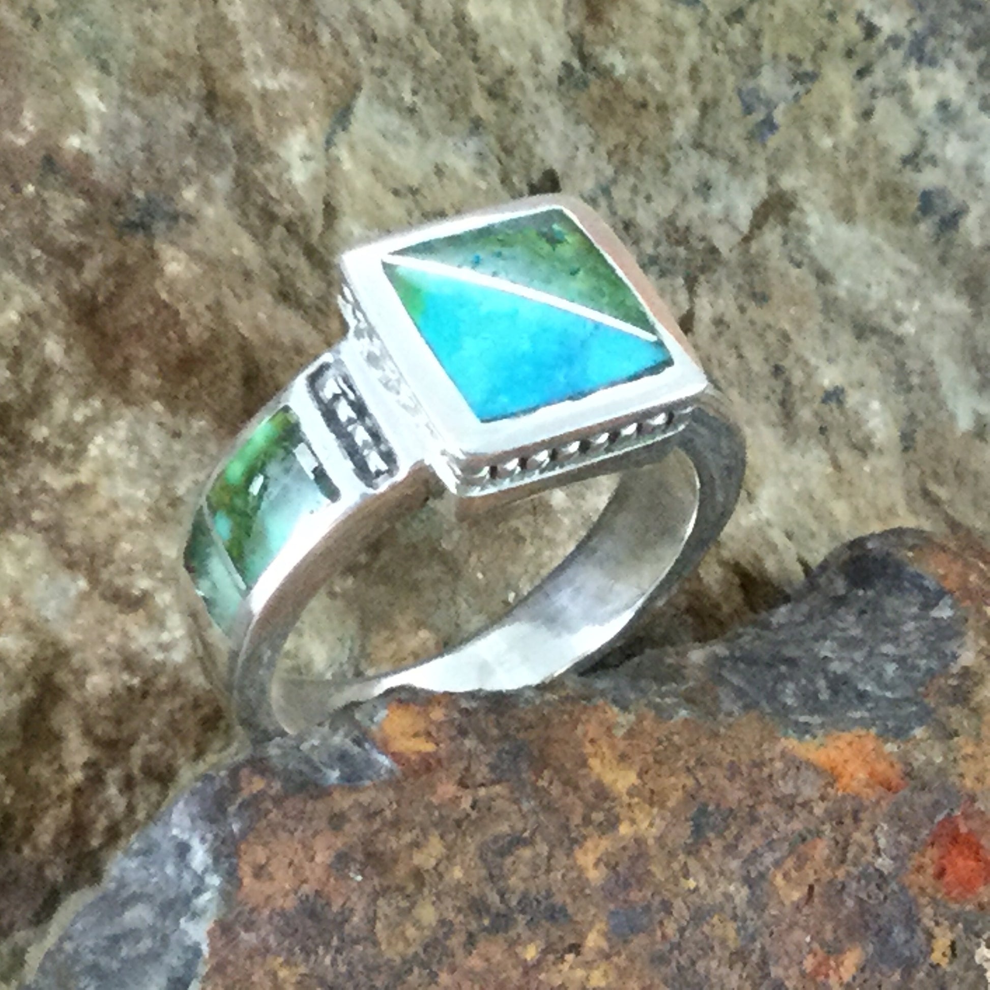 The ring is designed by David Rosales, one of the finest contemporary Southwest Artists in the world. He is the founder and co-owner of Supersmiths, Inc. of Gallup, NM.