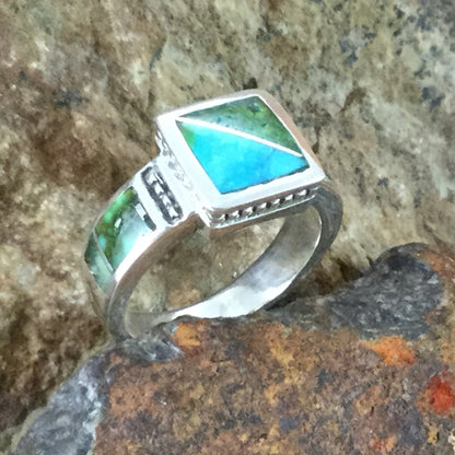 This beautiful Sterling Silver Ring showcases the spectacular Green, Blue and Yellow hues of Sonoran Gold Turquoise from Mexico.