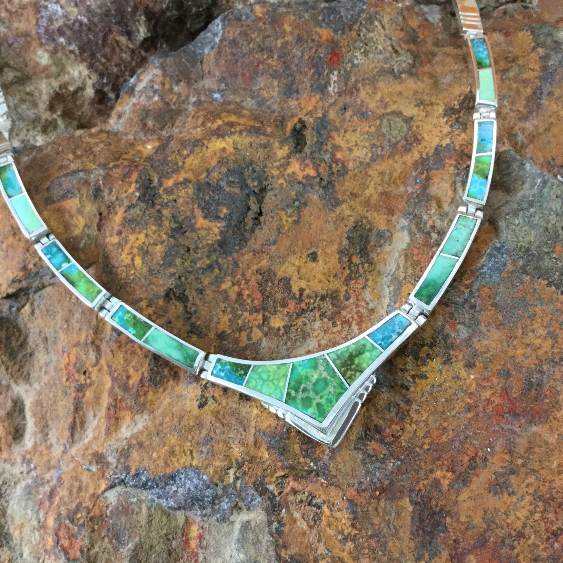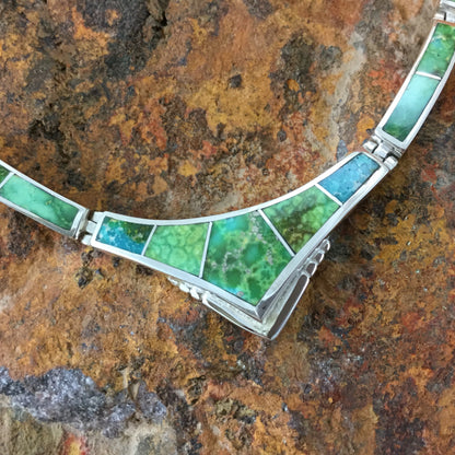 This gorgeous Sterling Silver Necklace showcase the spectacular Green, Blue and Yellow hues of Sonoran Gold Turquoise from Mexico.