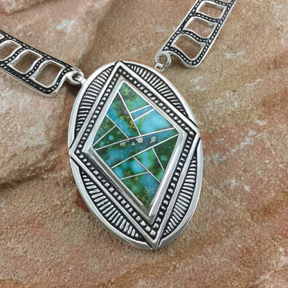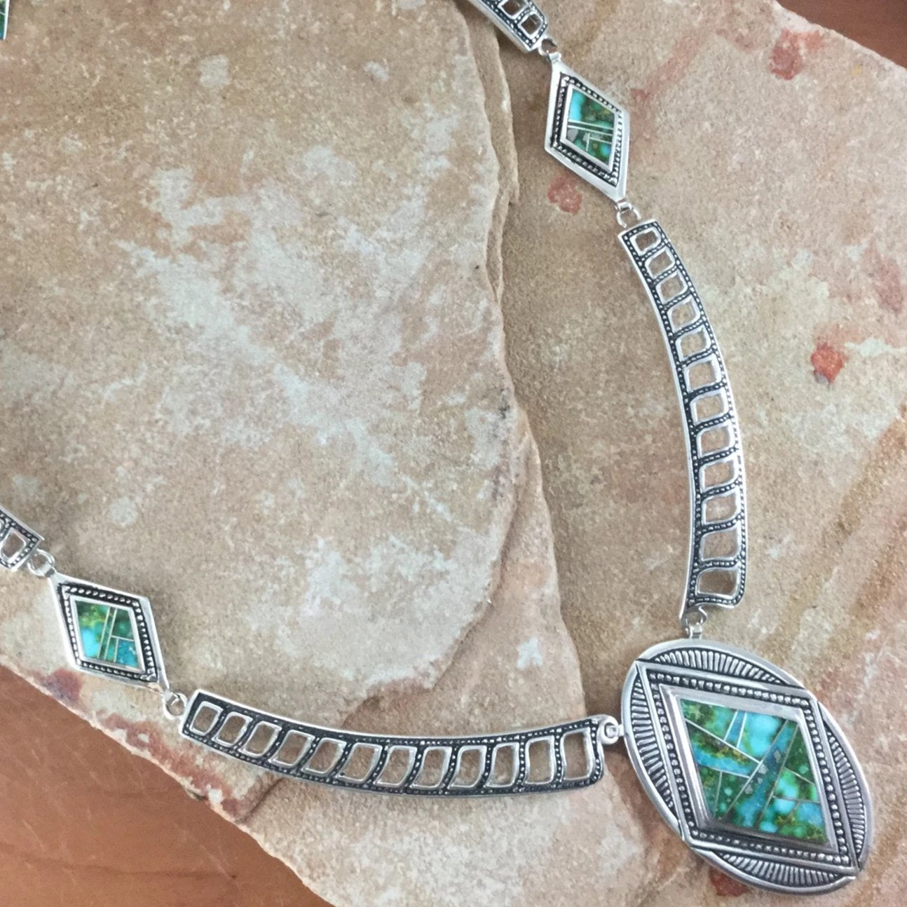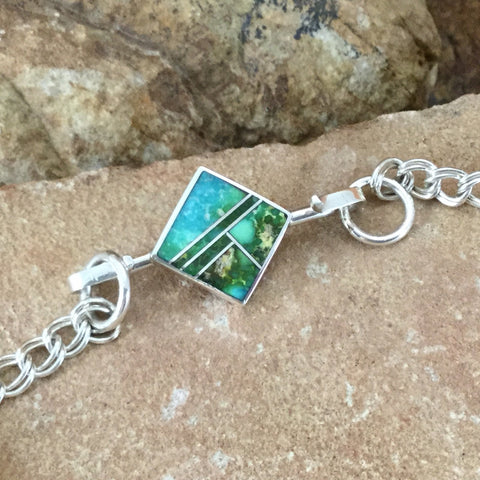 This gorgeous Sterling Silver Necklace showcase the spectacular Green, Blue and Yellow hues of Sonoran Gold Turquoise from Mexico. It features Handcrafted Sterling Silver Chain Links and a specially designed clasp to keep each side of the Necklace at equal lengths.