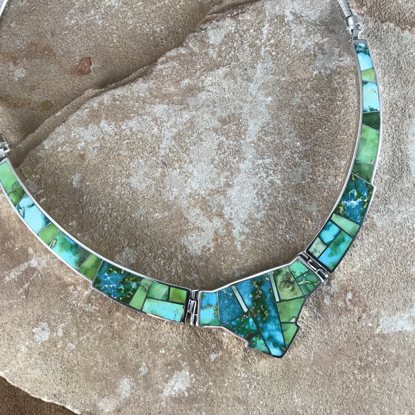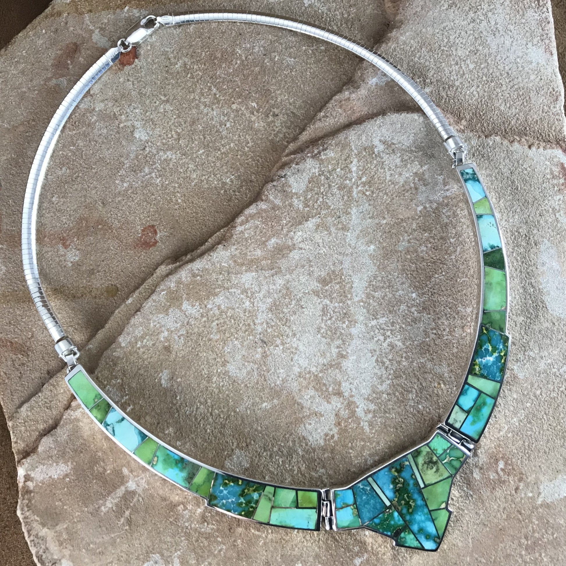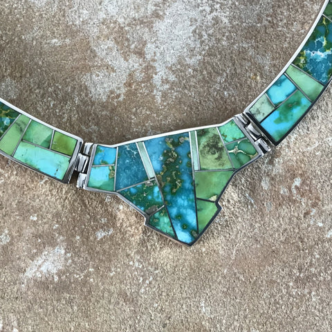 This gorgeous Sterling Silver Necklace showcase the spectacular Green, Blue and Yellow hues of Sonoran Gold Turquoise from Mexico.
