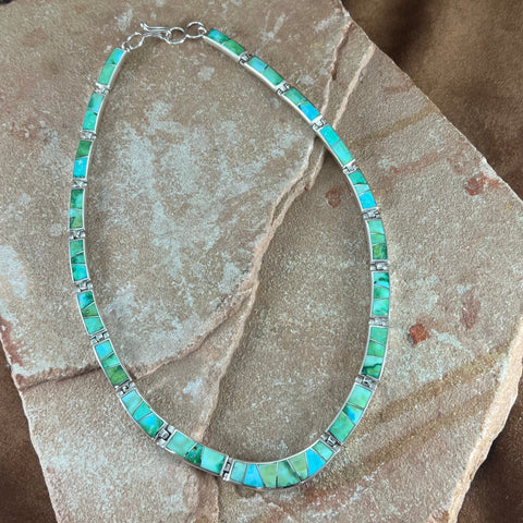 This gorgeous Sterling Silver Necklace showcase the spectacular Green, Blue and Yellow hues of Sonoran Gold Turquoise from Mexico.