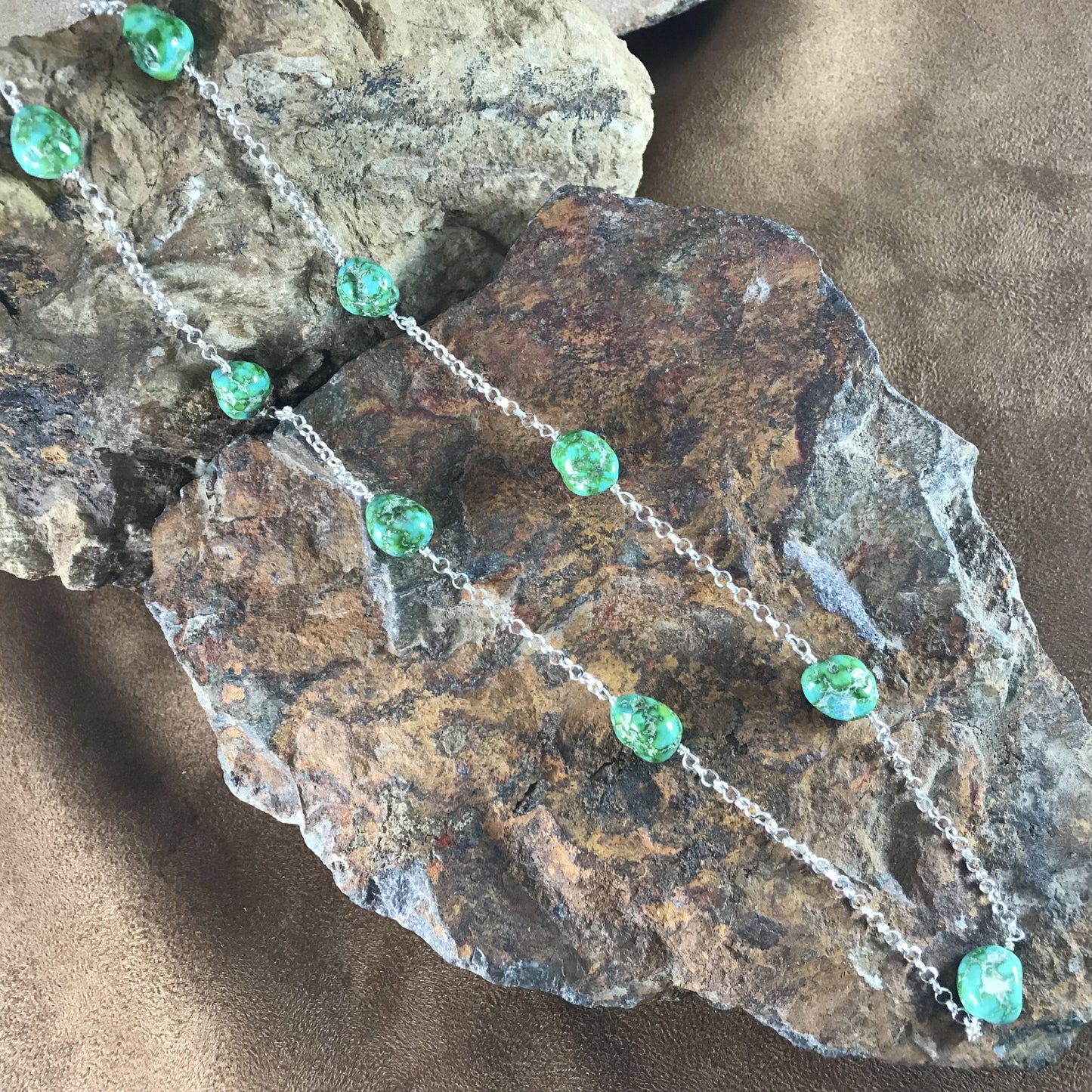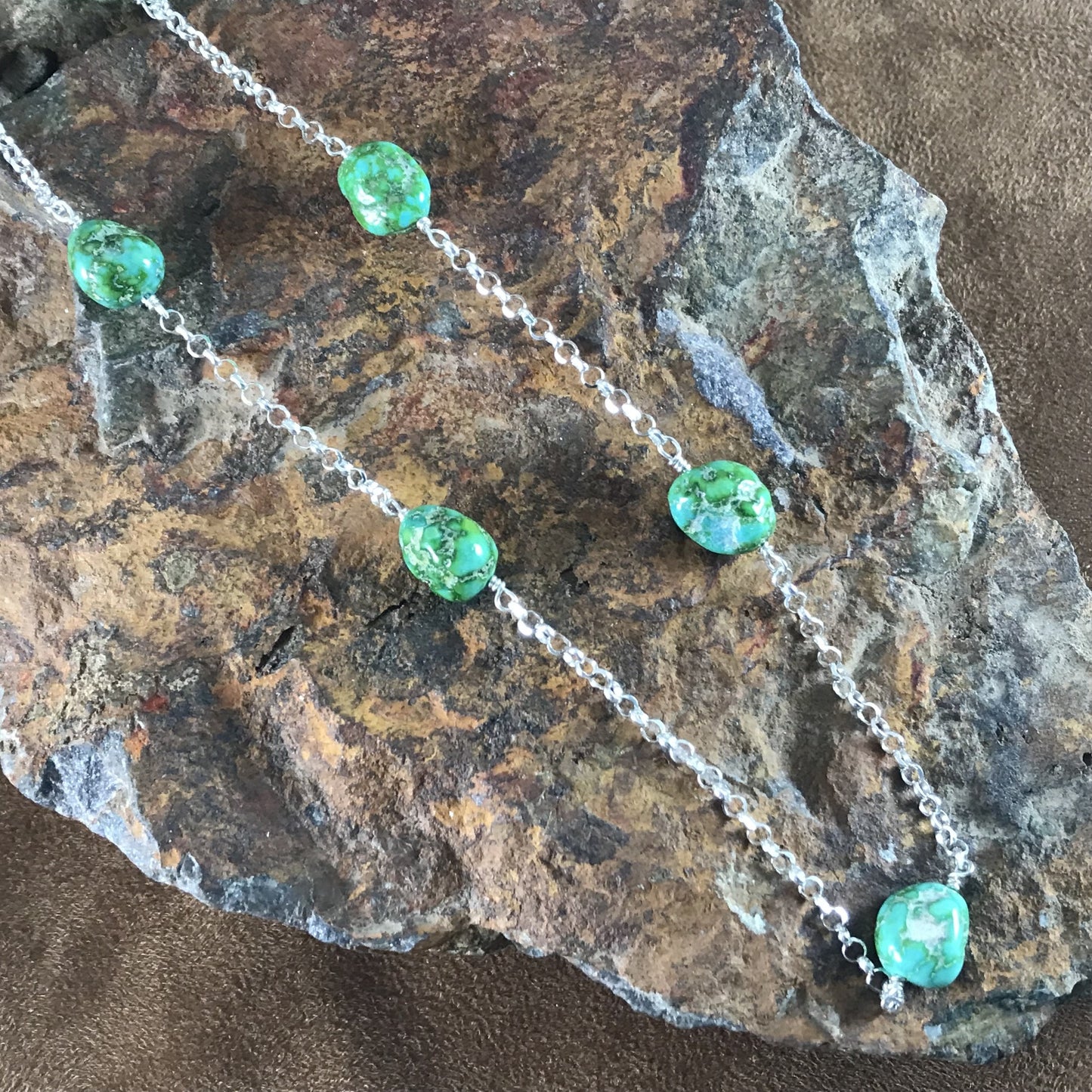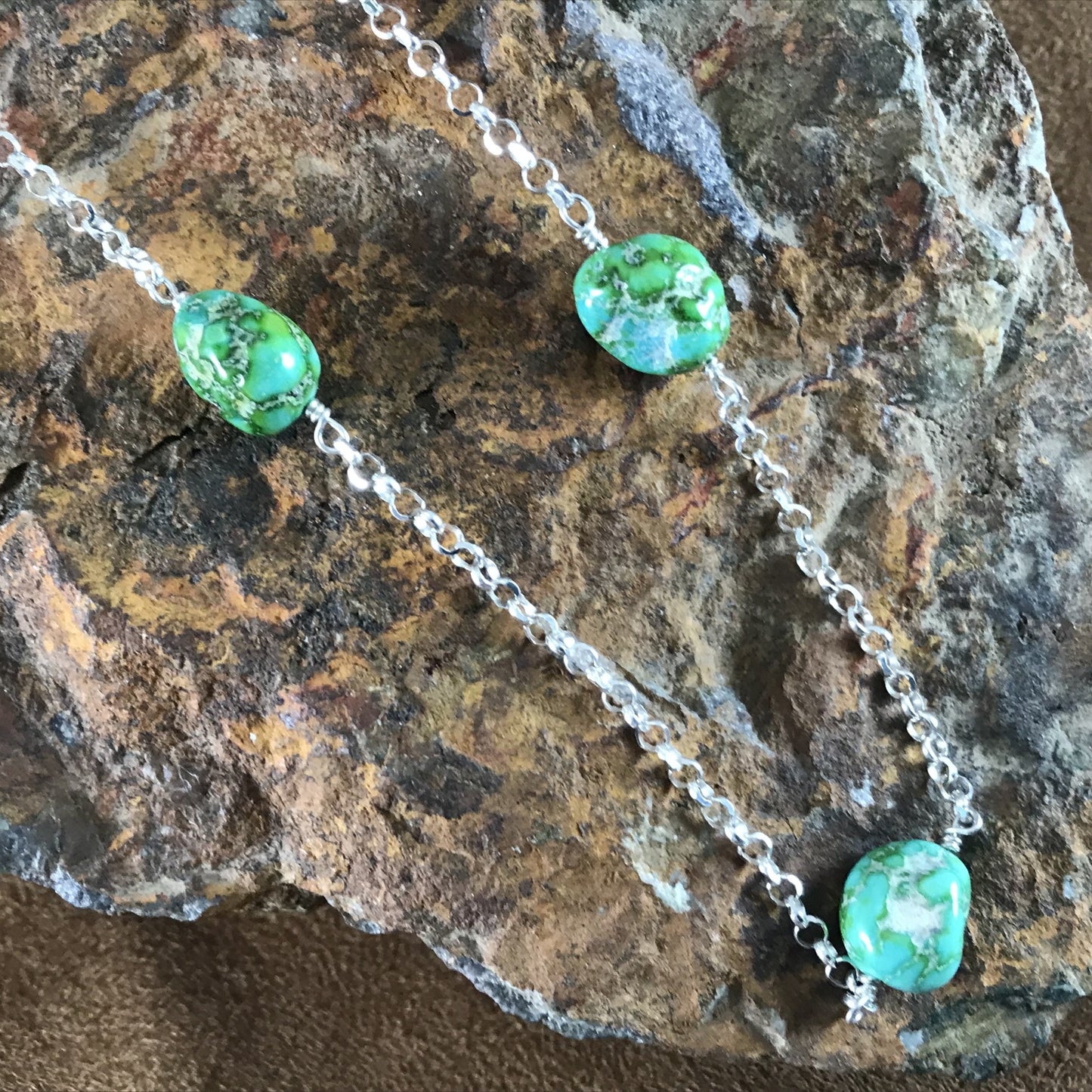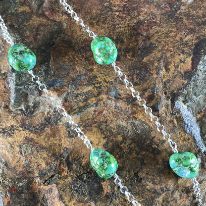 This gorgeous Sterling Silver Necklace with chain showcase the spectacular Green, Blue and Golden hues of Sonoran Gold Turquoise Nuggets from Mexico.