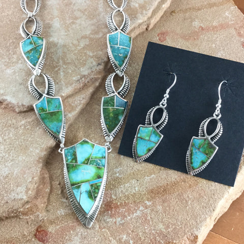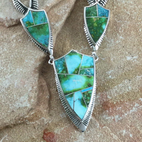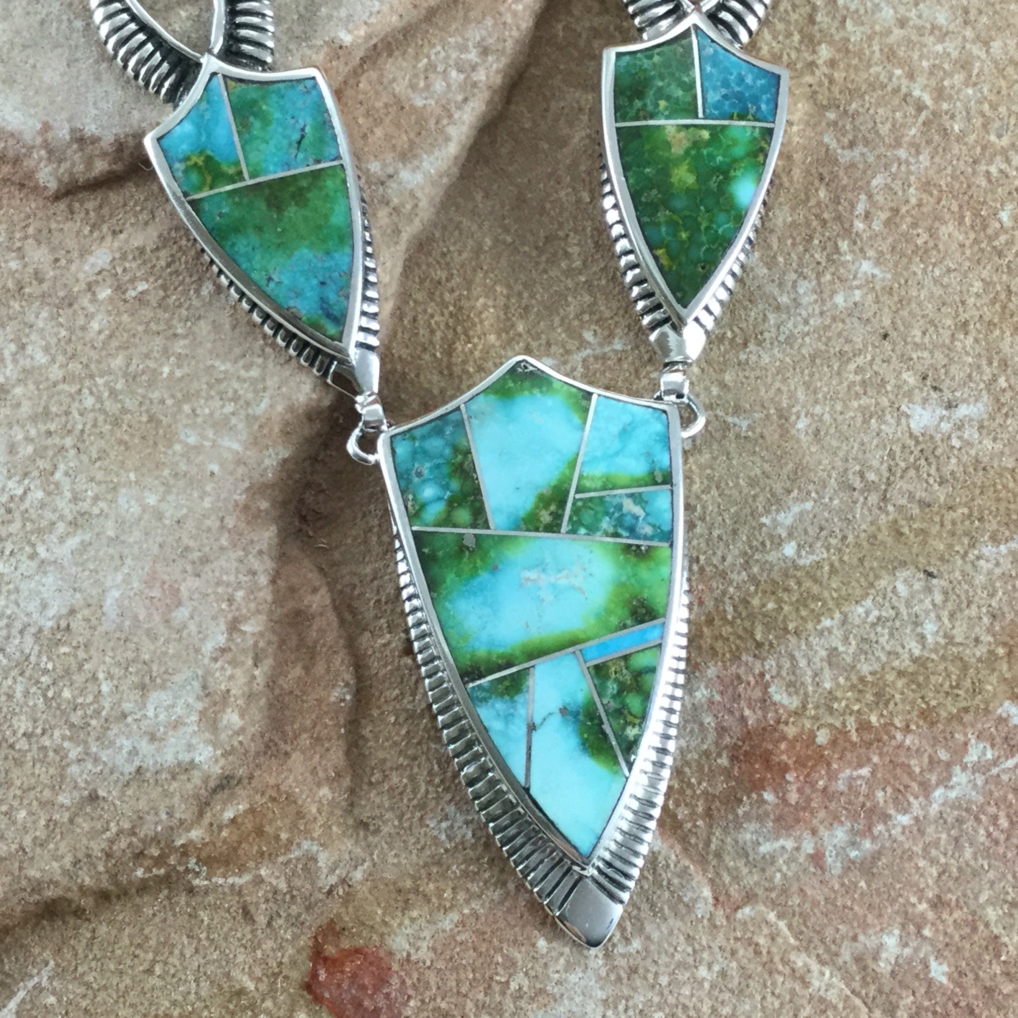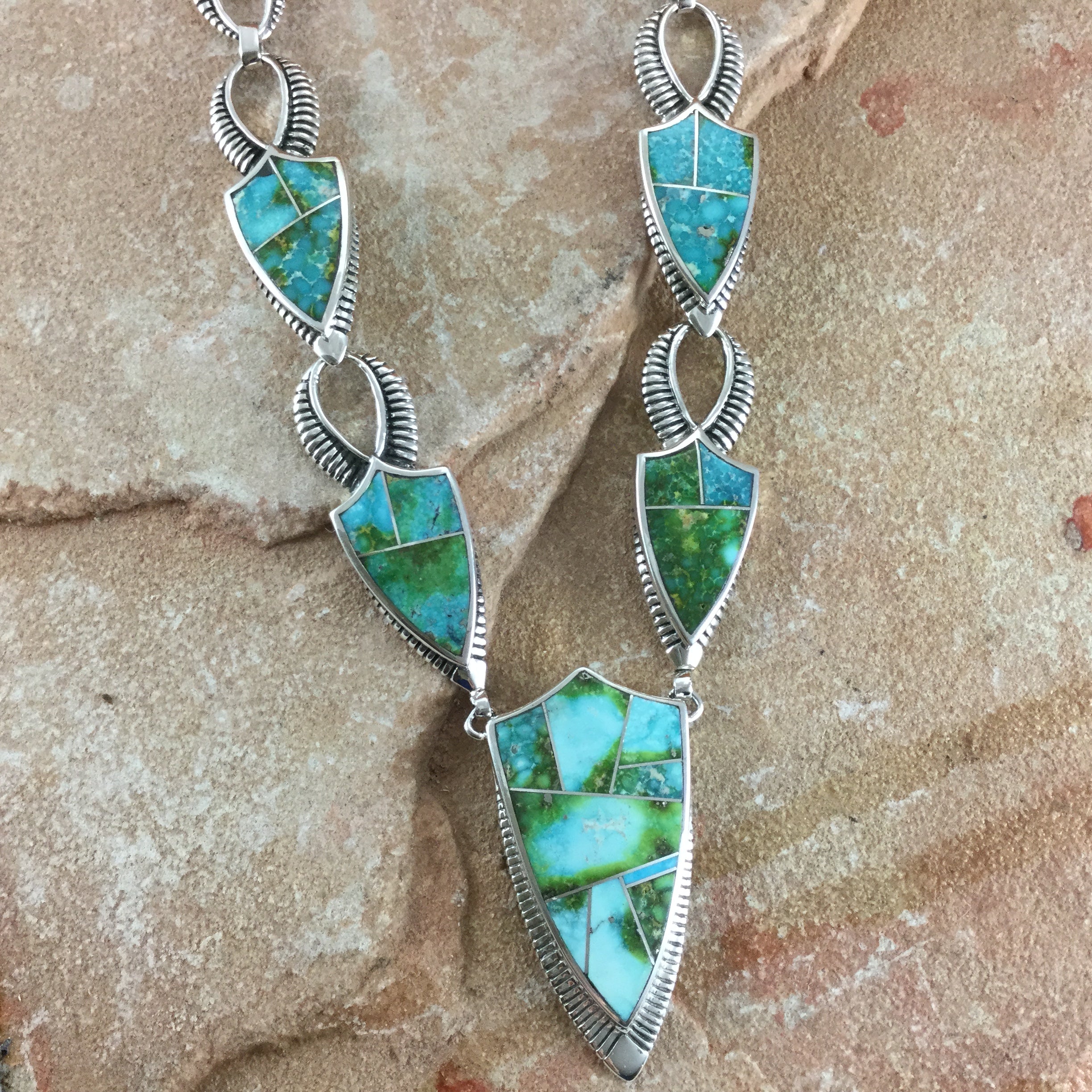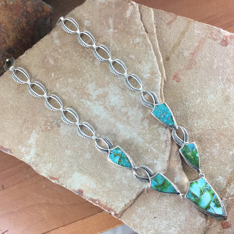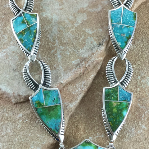 This gorgeous Sterling Silver Necklace has 5 individual stones showcasing the spectacular Green, Blue and Yellow hues of Sonoran Gold Turquoise from Mexico. It features a Double End Clasp with a Sonoran Gold Stone setting, allowing for equal length chain drops on each side of the Clasp.