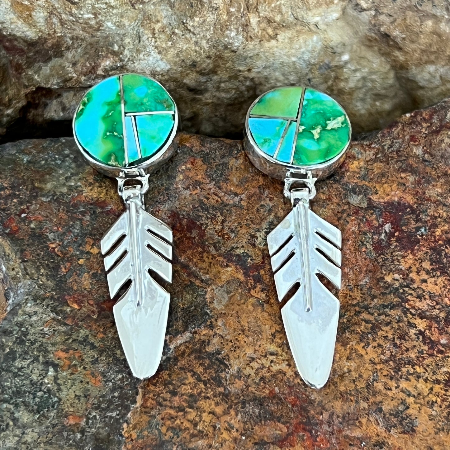 David Rosales Sonoran Gold Turquoise Inlaid Sterling Silver Earrings Feathers