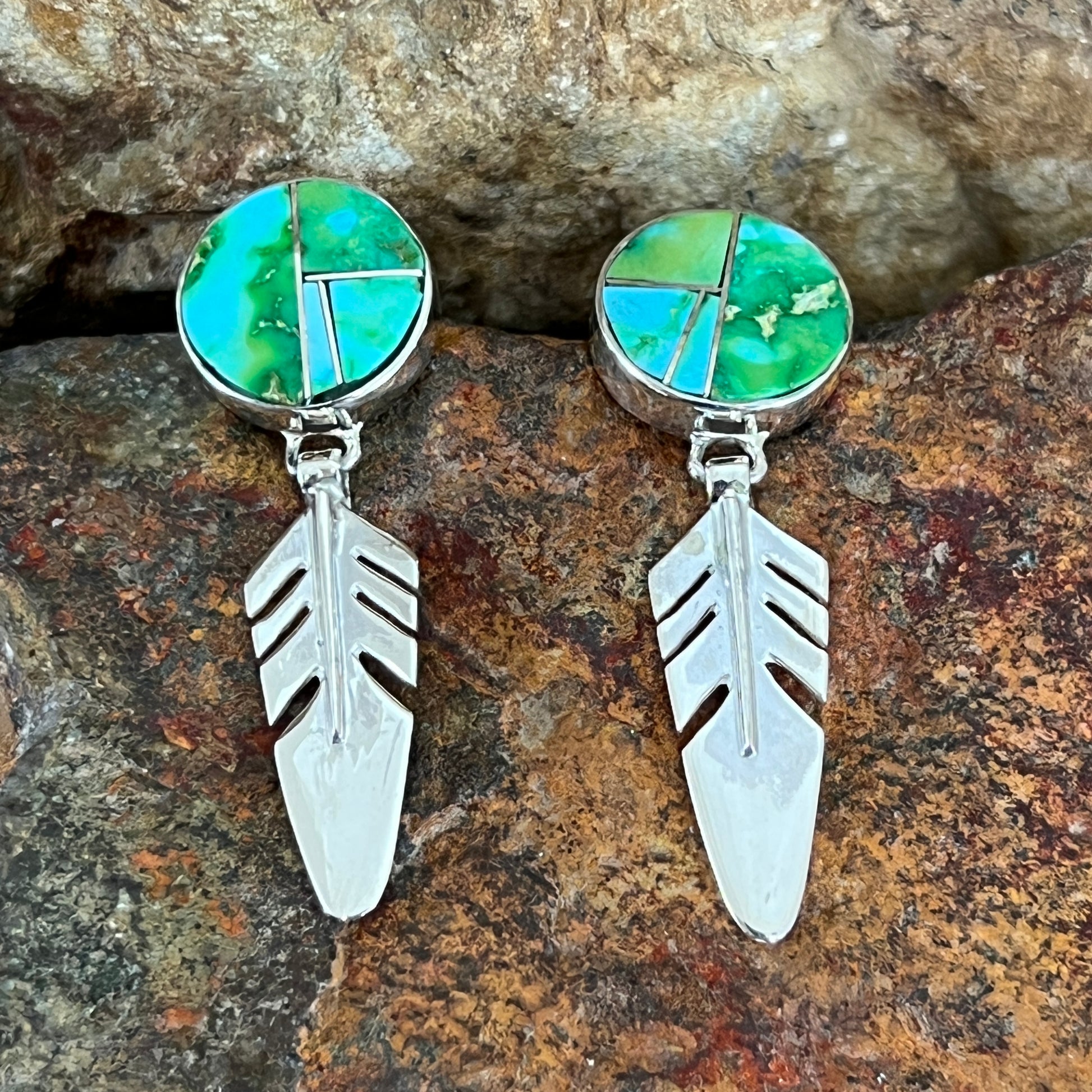 These gorgeous Sterling Silver Feather Earrings showcase the spectacular Green, Blue and Yellow hues of Sonoran Gold Turquoise from Mexico.