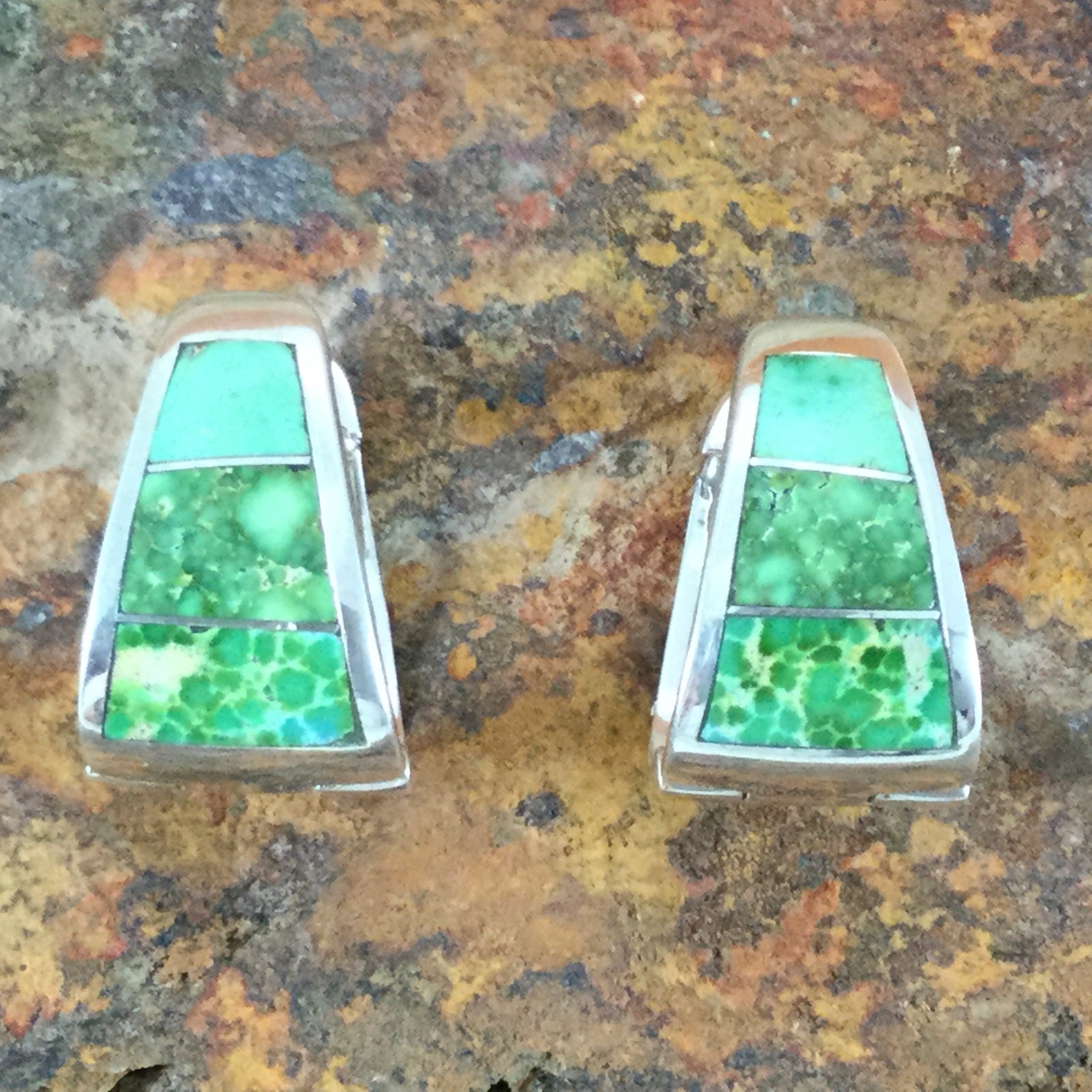 These gorgeous Sterling Silver Earrings feature the spectacular Green, Blue and Yellow hues of Sonoran Gold Turquoise from Mexico. .