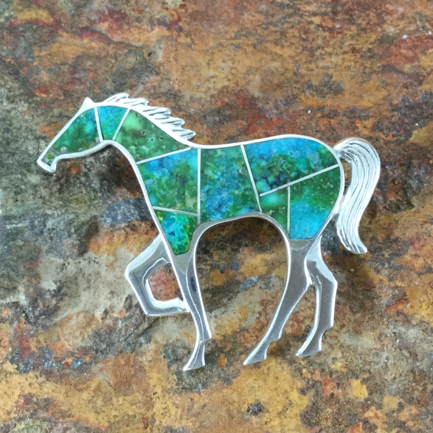 Ask a question about David Rosales Sonoran Gold Turquoise Inlaid Sterling Silver Pin Horse