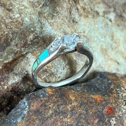 David Rosales Sonoran Gold Turquoise Inlaid Sterling Silver Ring w/ Cubic Zirconia
