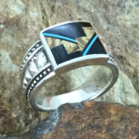 This beautiful Sterling Silver Ring, as part of the Turquoise Creek Collection, features a Fancy Inlay Pattern of Black Jade, Picture Jasper, and Kingman Turquoise.