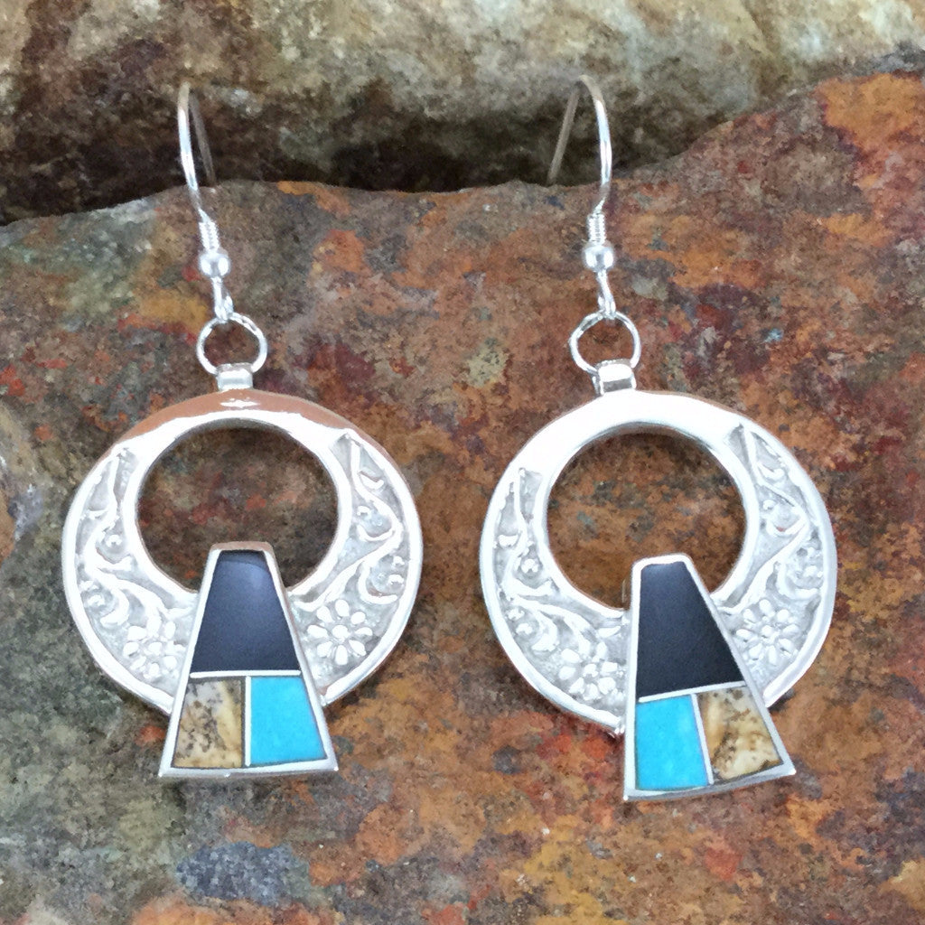These gorgeous Sterling Silver Earrings, as part of the Turquoise Creek Collection, features Black Jade, Picture Jasper and Kingman Turquoise.