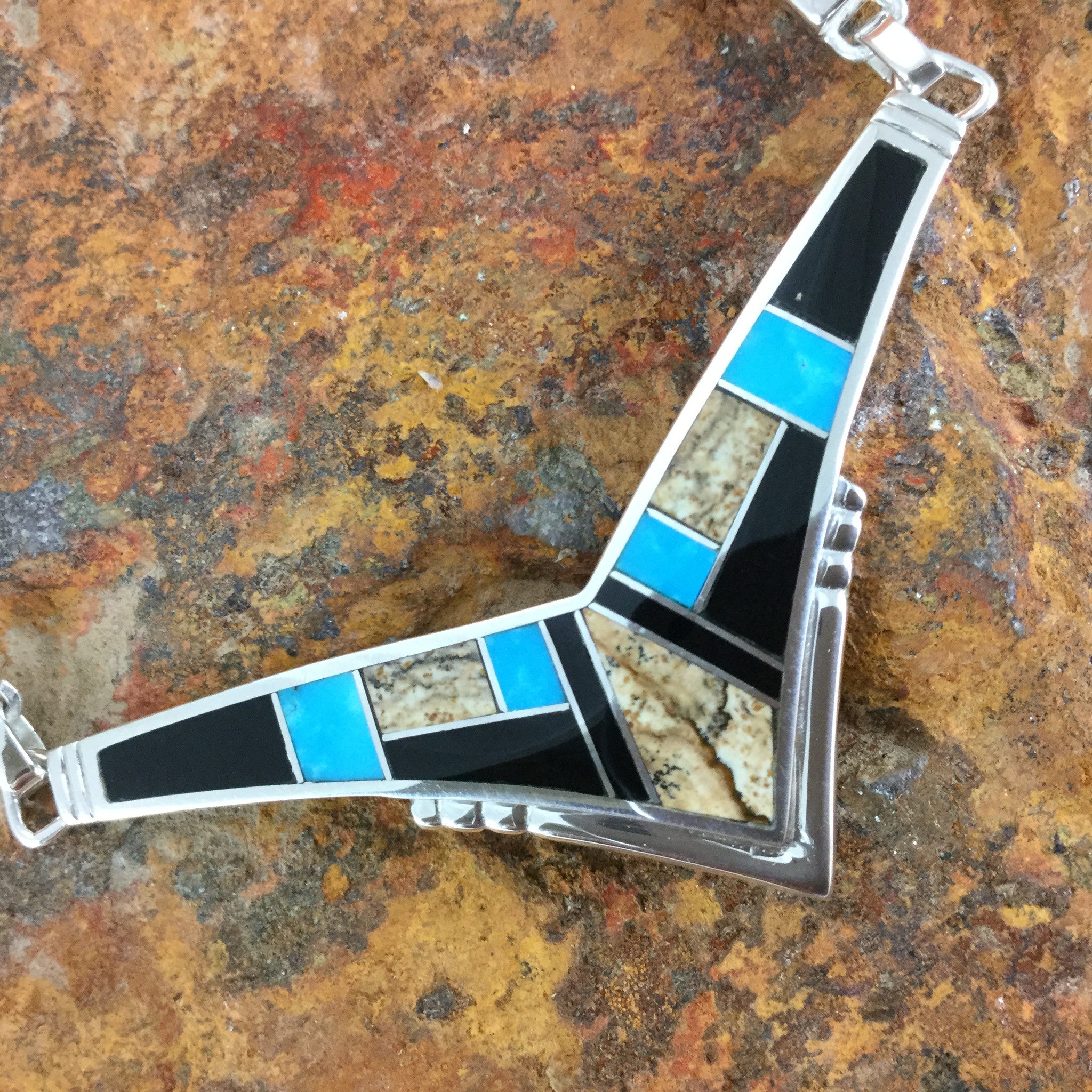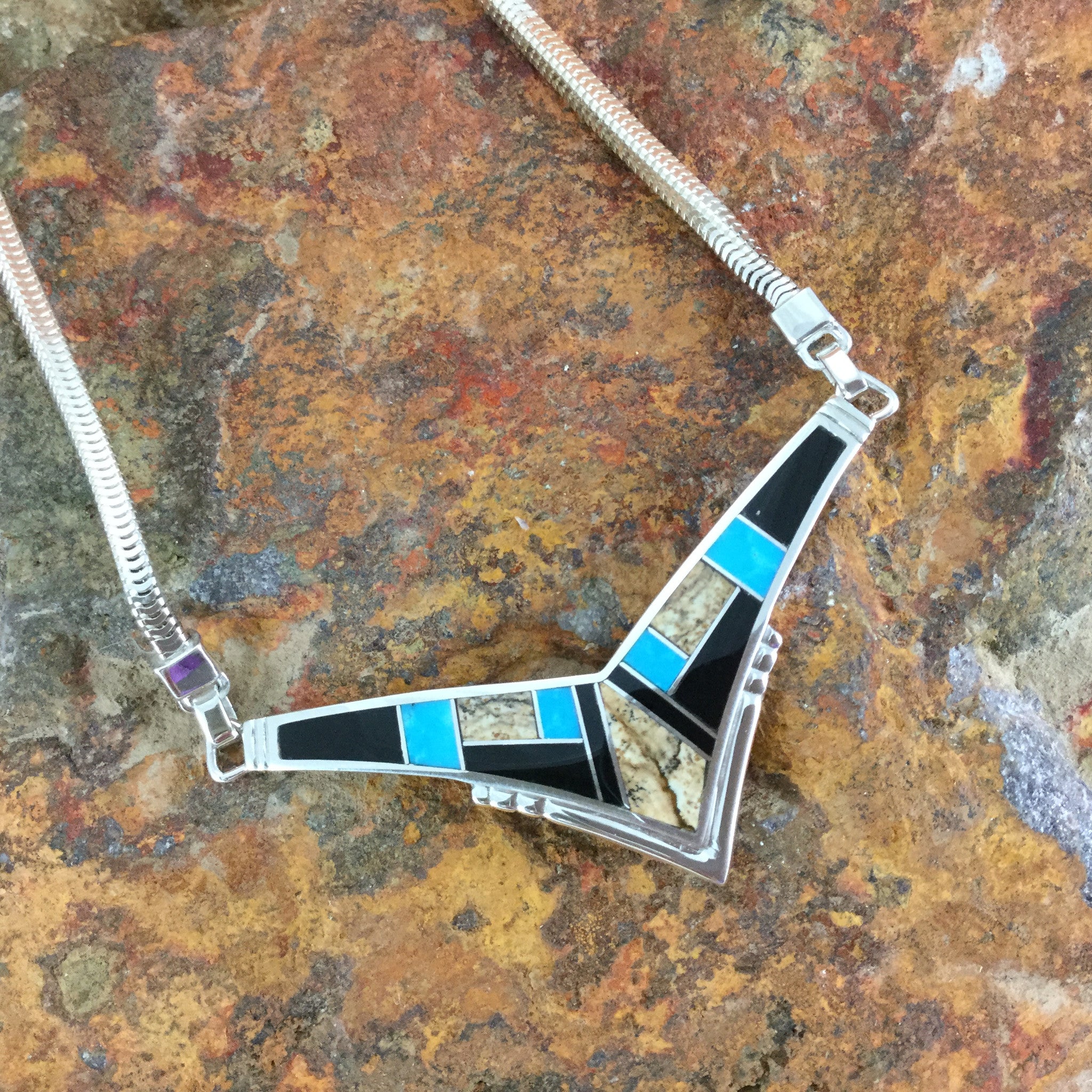 This gorgeous Sterling Silver Necklace shown in the Turquoise Creek Collection, features Black Jade, Picture Jasper, and Kingman Turquoise.