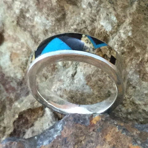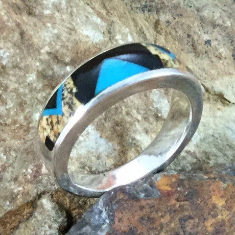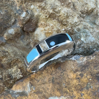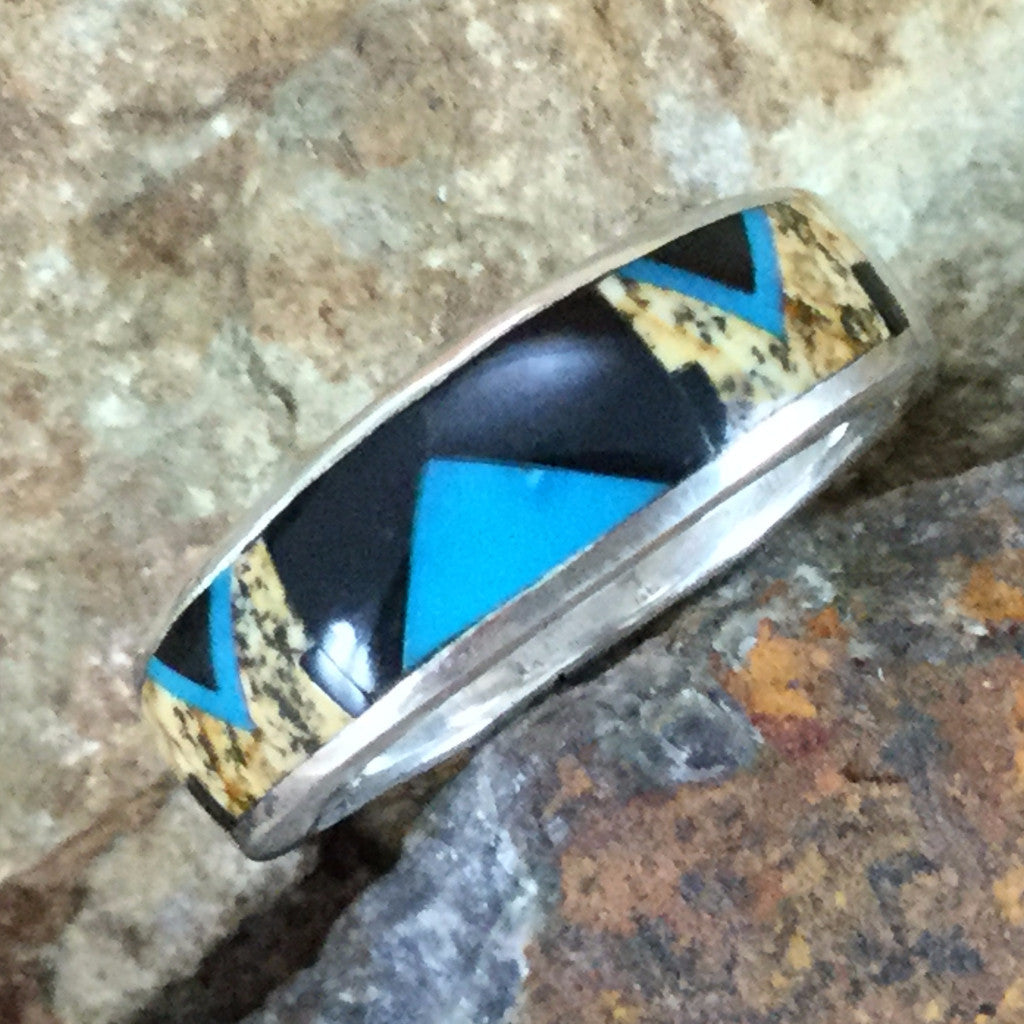 This beautiful Sterling Silver Ring, as part of the Turquoise Creek Collection, features Black Jade, Picture Jasper, and Kingman Turquoise.