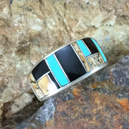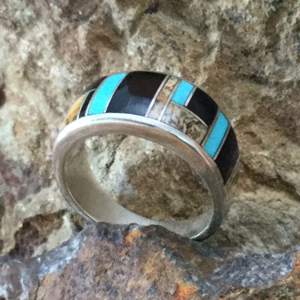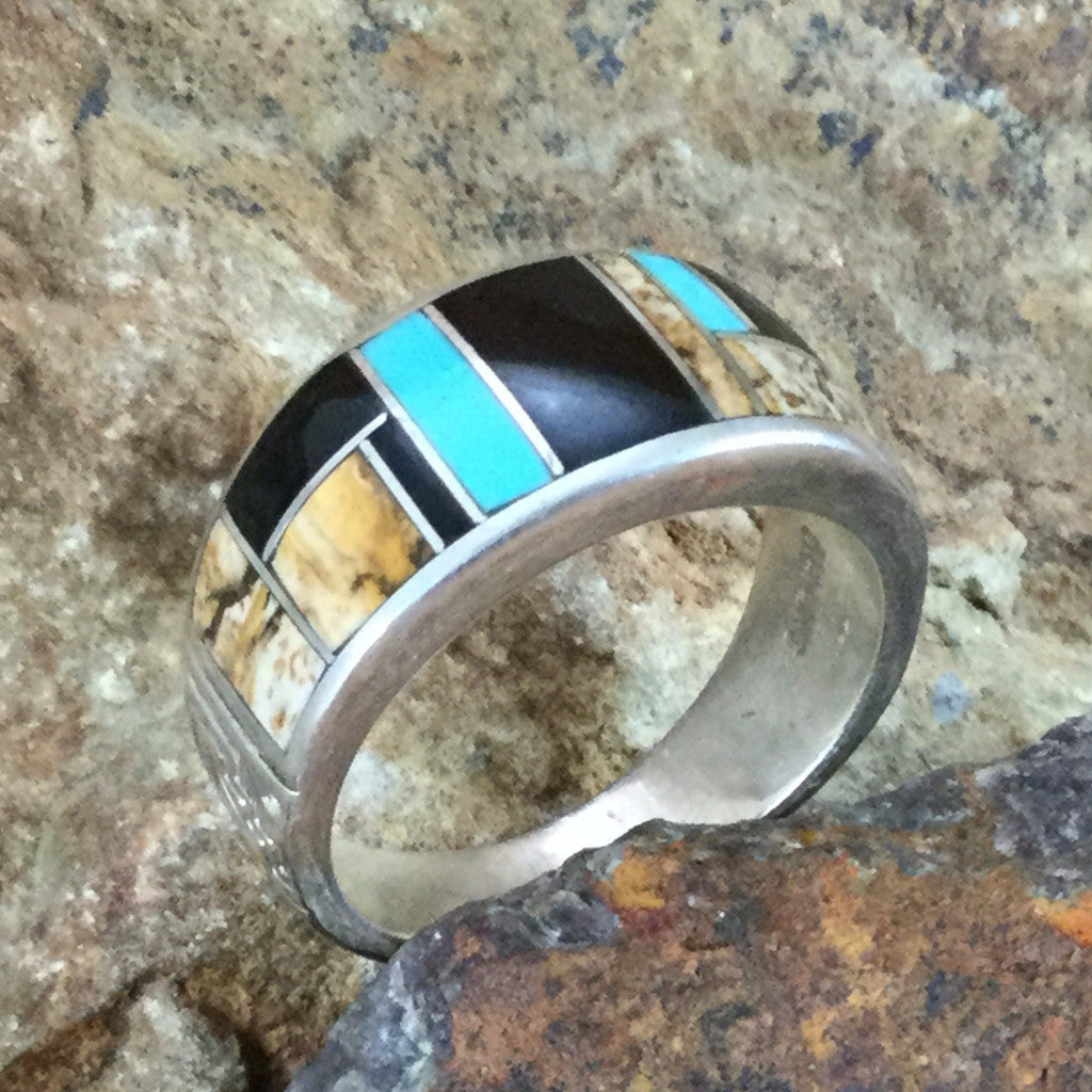 This beautiful Sterling Silver Ring, as part of the Turquoise Creek Collection, features Black Jade, Picture Jasper, and Kingman Turquoise.