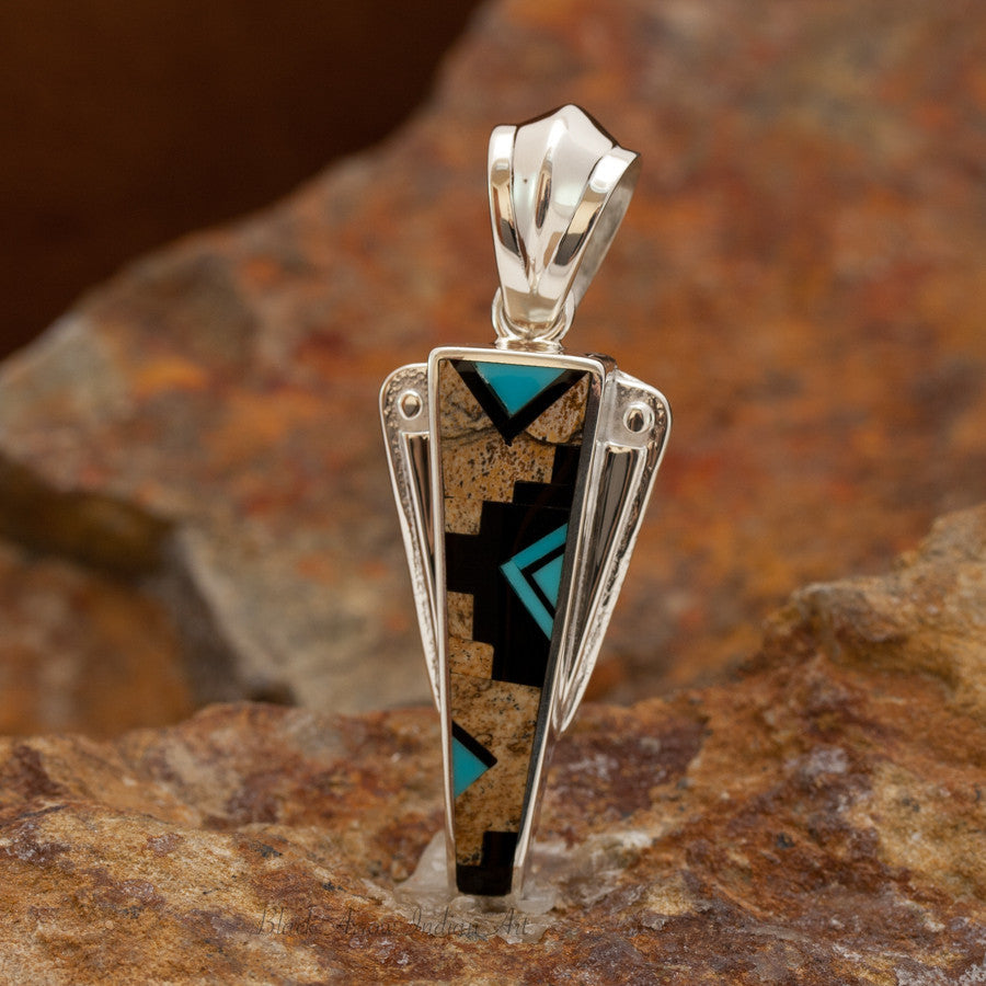 This beautiful Sterling Silver Pendant, as part of the Turquoise Creek Collection, features Black Jade, Picture Jasper and Kingman Turquoise.