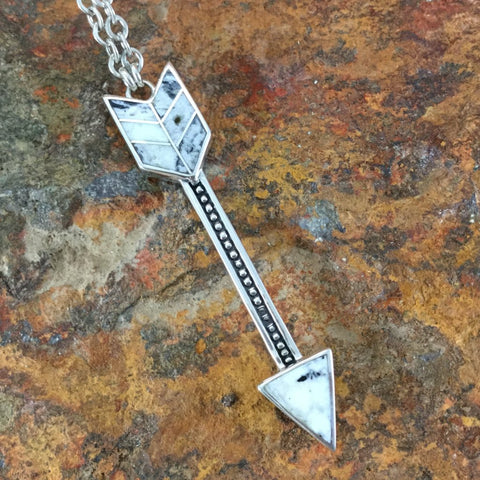 This eye-catching Sterling Silver Arrow Necklace Pendant, as part of the NEW White Buffalo Collection features Opalized Calcite, Quartz and Black Chert.