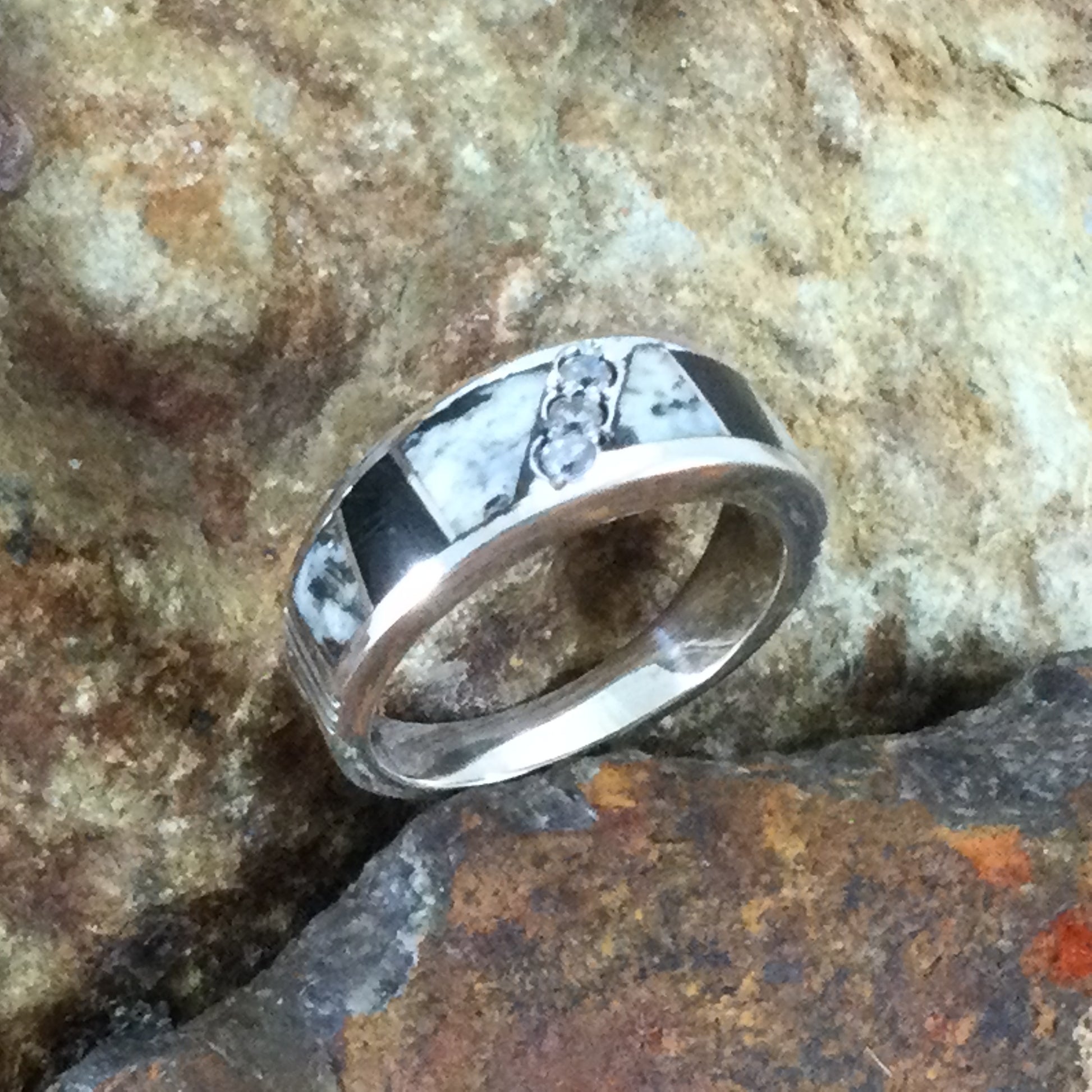 This beautiful Sterling Silver Ring, as part of the White Buffalo Collection feature Opalized Calcite, Quartz and Black Chert with a cascade of three small Cubic Zirconia in the center.