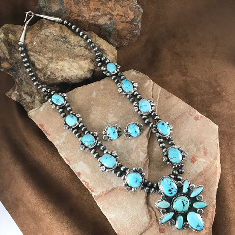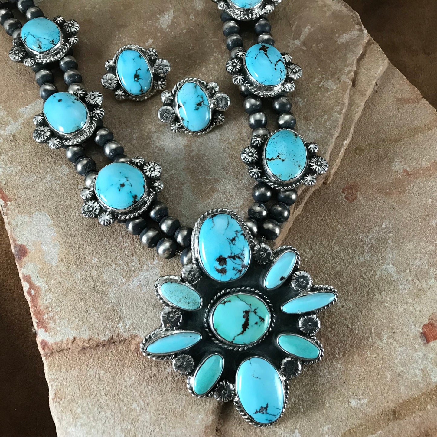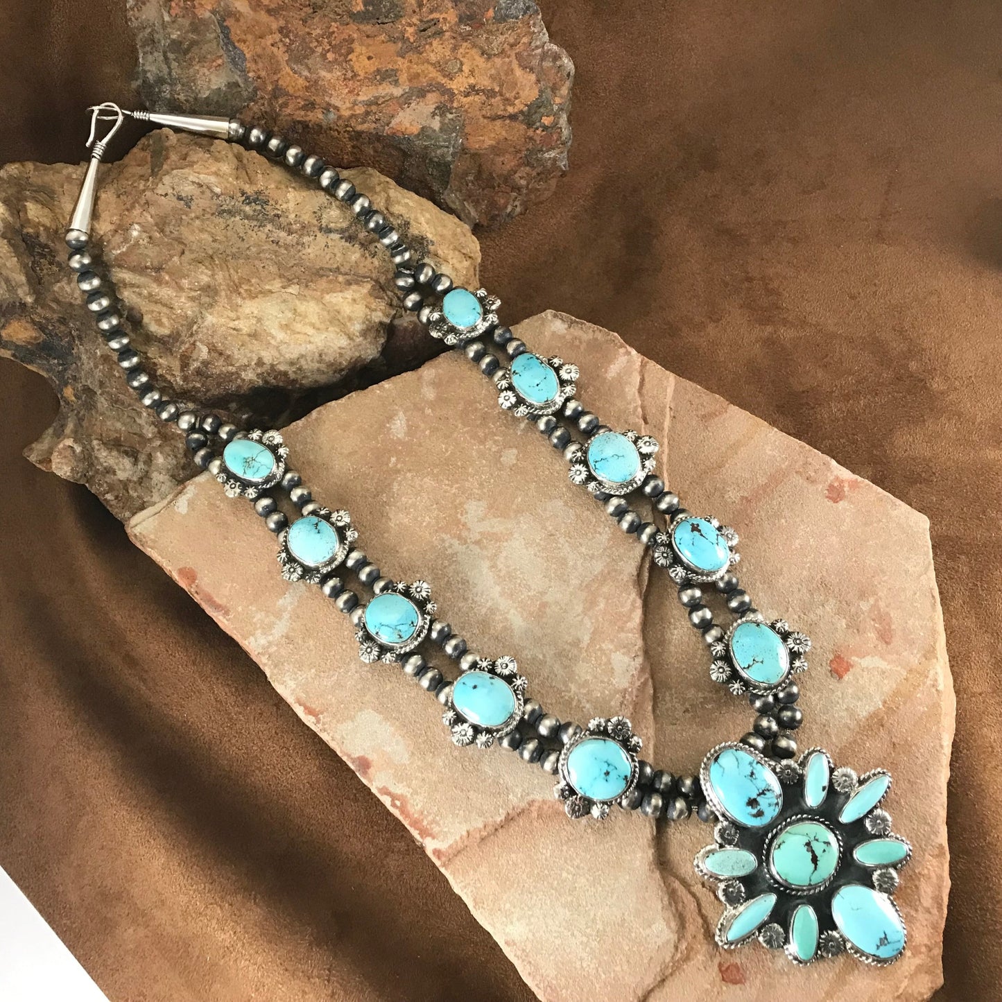 - Necklace has 10 Sterling Silver Settings, each set with Dry Creek Turquoise Stones with Sterling Silver Handcrafted Rope Edge and Spots