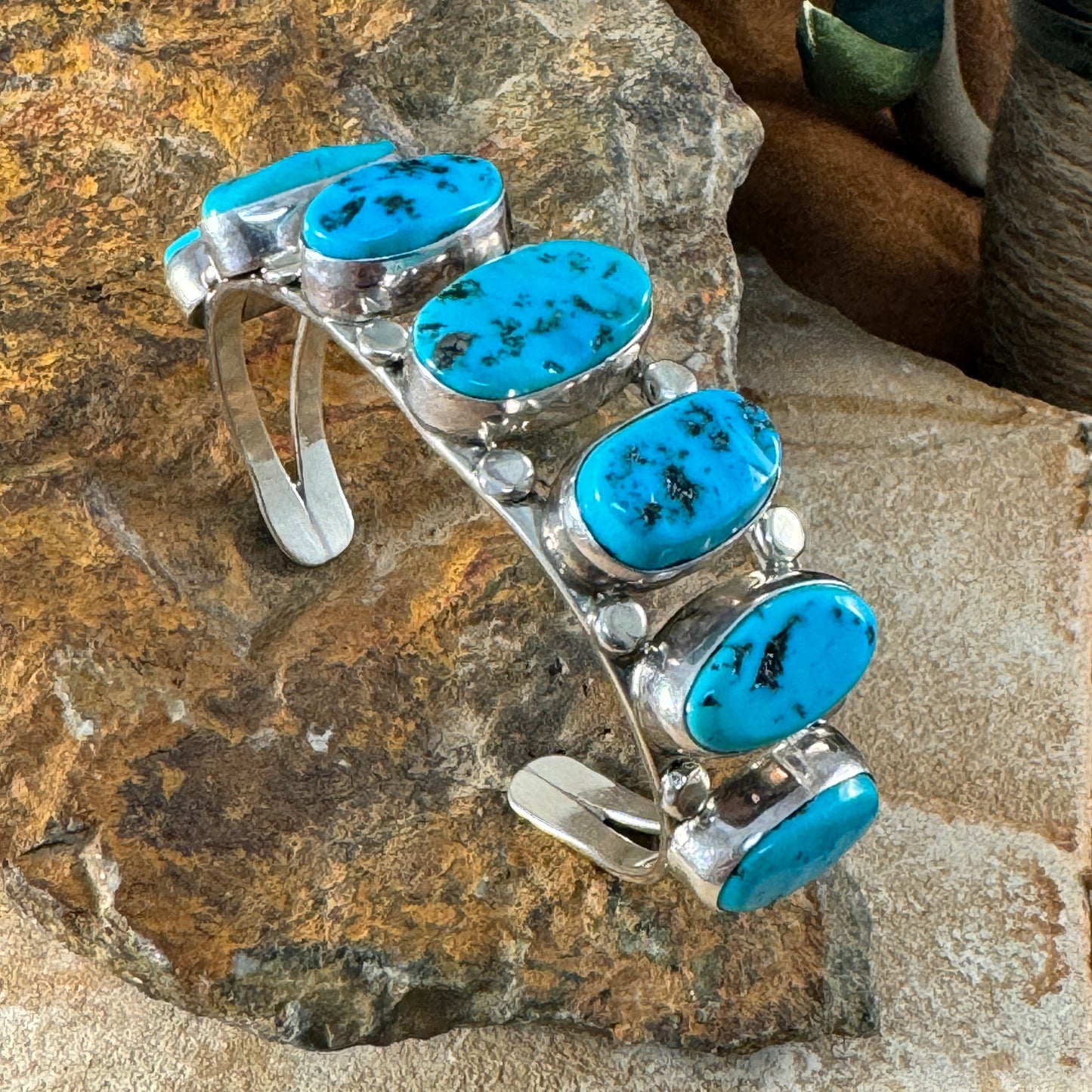 This vintage Navajo cuff bracelet is adorned with Seven large, vibrant turquoise stones, each surrounded by silver beaded detailing and silver beads. The stones’ natural matrix patterns give this piece a unique character, while the double-band cuff structure offers both durability and style. Perfect for any occasion, this piece is a testament to the skill of Navajo silversmiths.