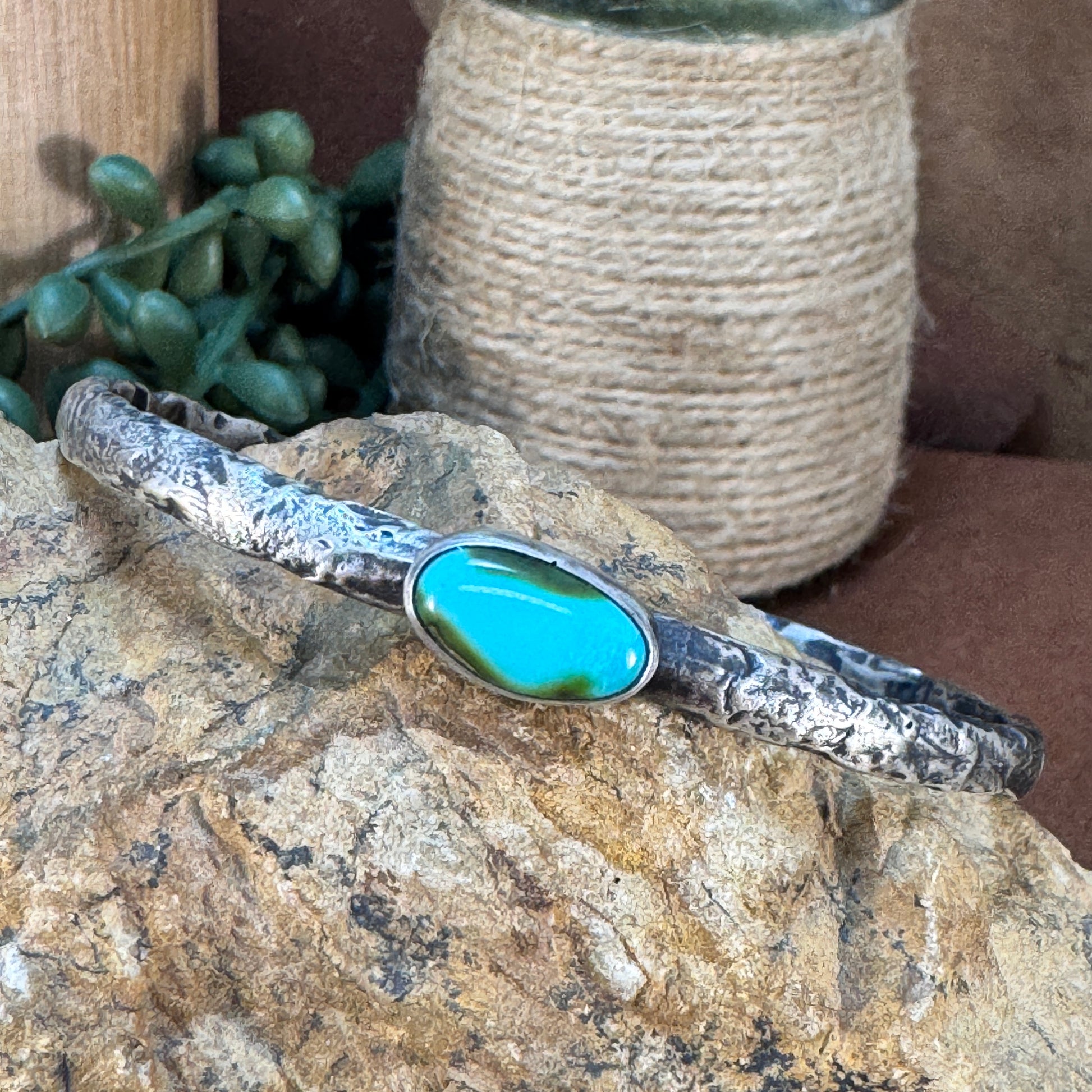 This sleek handcrafted cuff is forged from heavy-gauge sterling silver with a deeply textured, oxidized finish. At the center, a smooth oval cabochon of Sonoran Gold Turquoise radiates a warm glow. The understated design highlights the natural beauty of the turquoise while offering a modern take on traditional Navajo craftsmanship. Created by Ray Coriz.