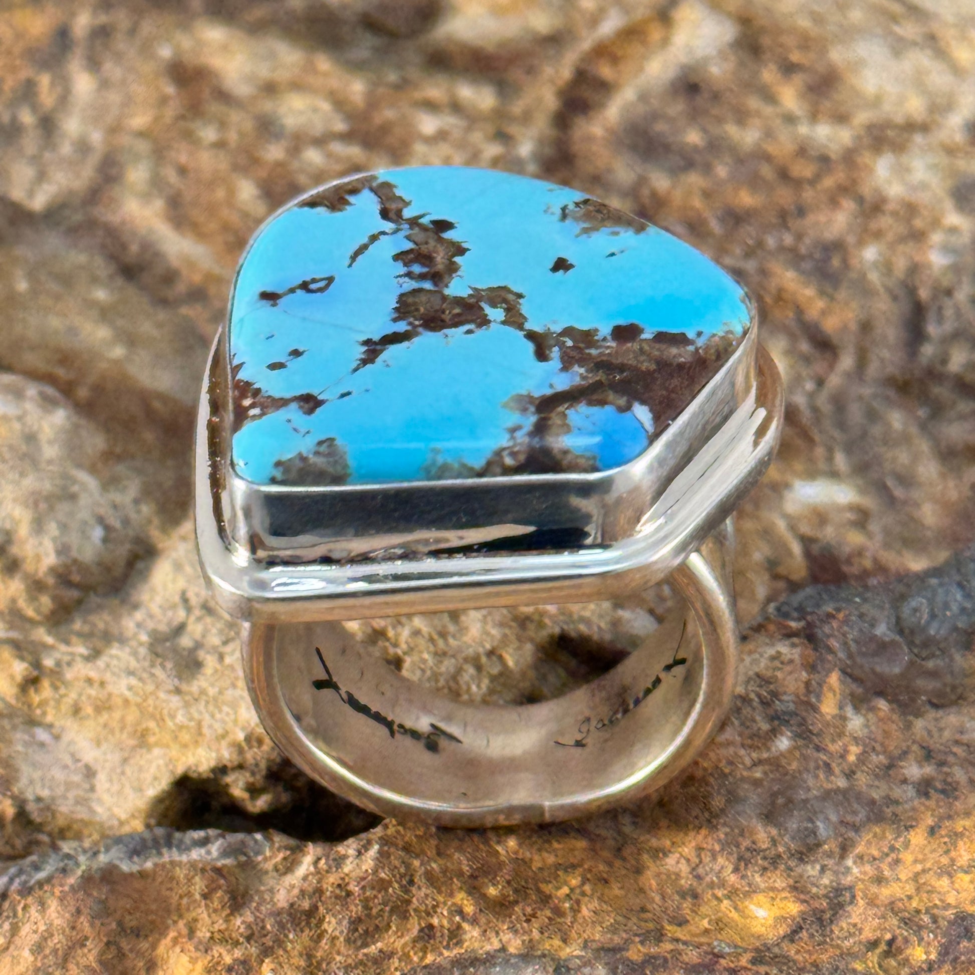 Featuring a bold, angular Golden Hill Turquoise stone with a striking icy blue color and natural brown matrix, this ring is a testament to Tommy Jackson's impeccable design. The sterling silver setting includes a beveled edge and a layered band for a contemporary yet timeless feel. The angular design of the stone enhances its unique beauty, making this a must-have piece for any collector or admirer of Navajo jewelry.