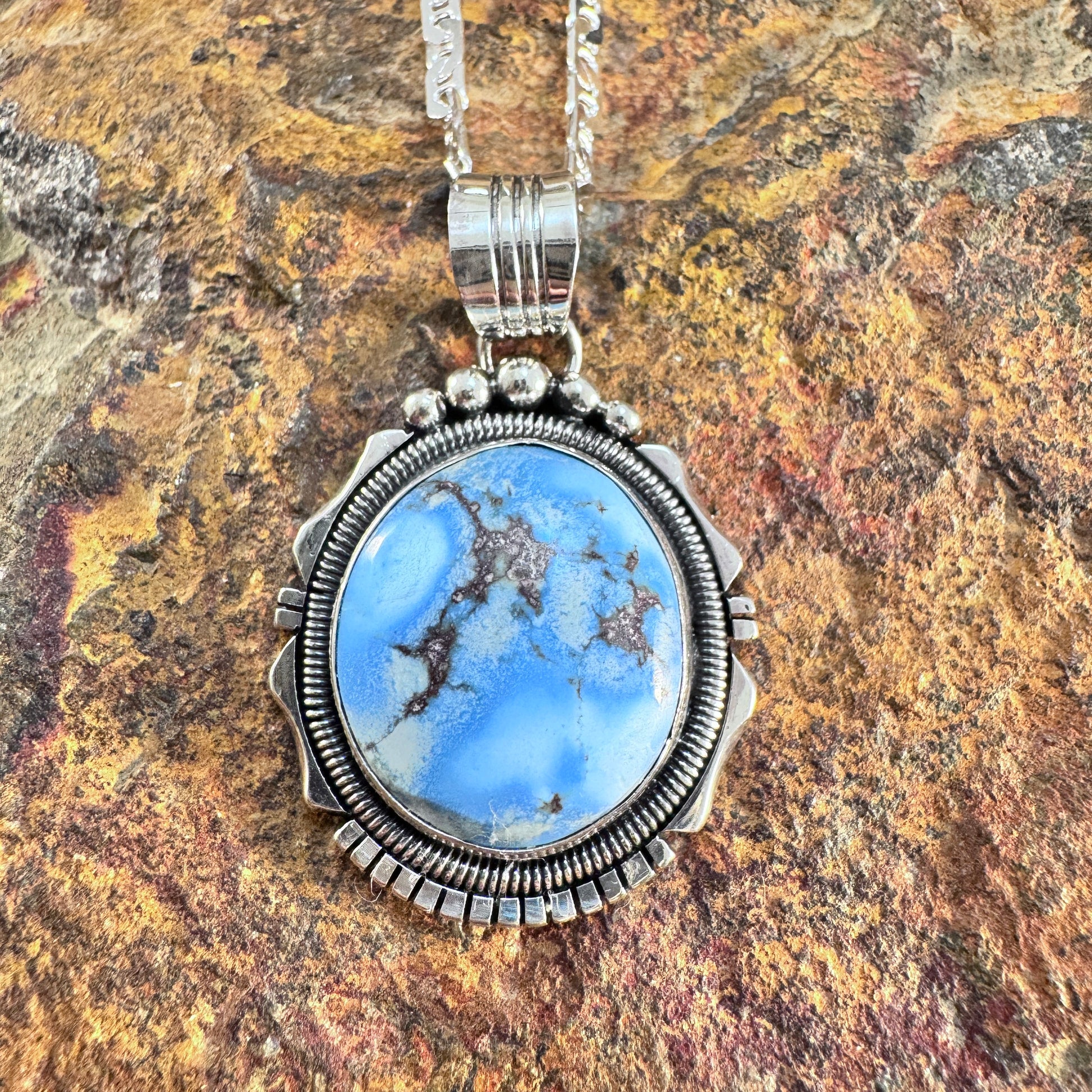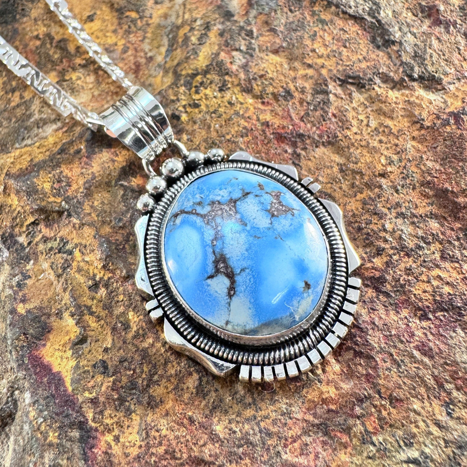 This striking pendant features an oval-cut Golden Hill Turquoise cabochon, set in a handcrafted sterling silver frame with deep oxidation and a layered bezel design. The stone showcases classic lavender-blue hues with dark chocolate and reddish-brown webbing unique to the Golden Hill mine in Kazakhstan. The bold silverwork includes rope accents, polished drops, and scalloped edges that enhance its vintage Navajo character. A triple-band bail accommodates a variety of chains or Navajo pearls.