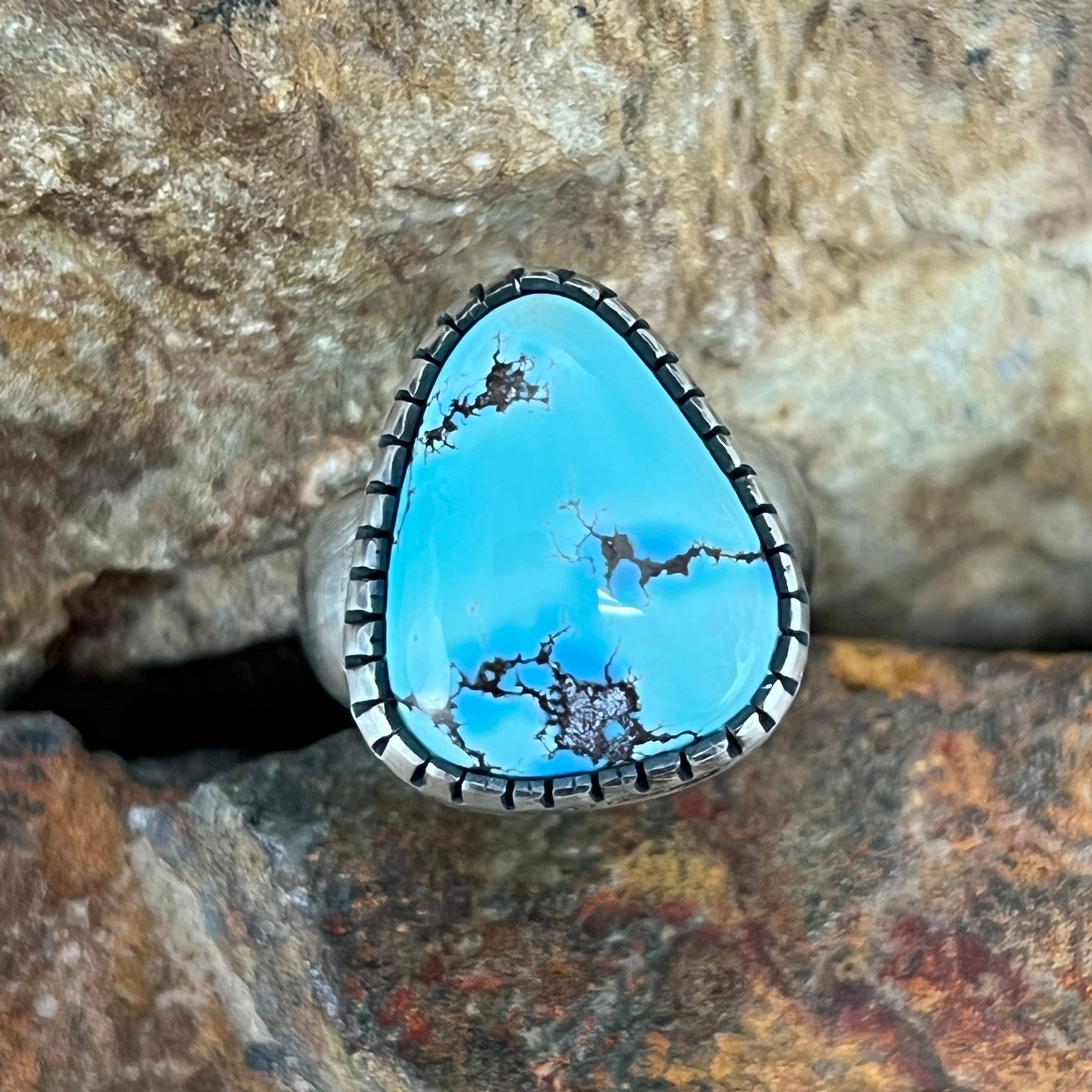 This Ring features Golden Hill Turquoise in a brushed Sterling Silver Hand Stamped Bezel setting, handcrafted by Native American Artisan Diane Wylie. These are a one-of-a kind piece. Color may vary from actual on computer monitor.