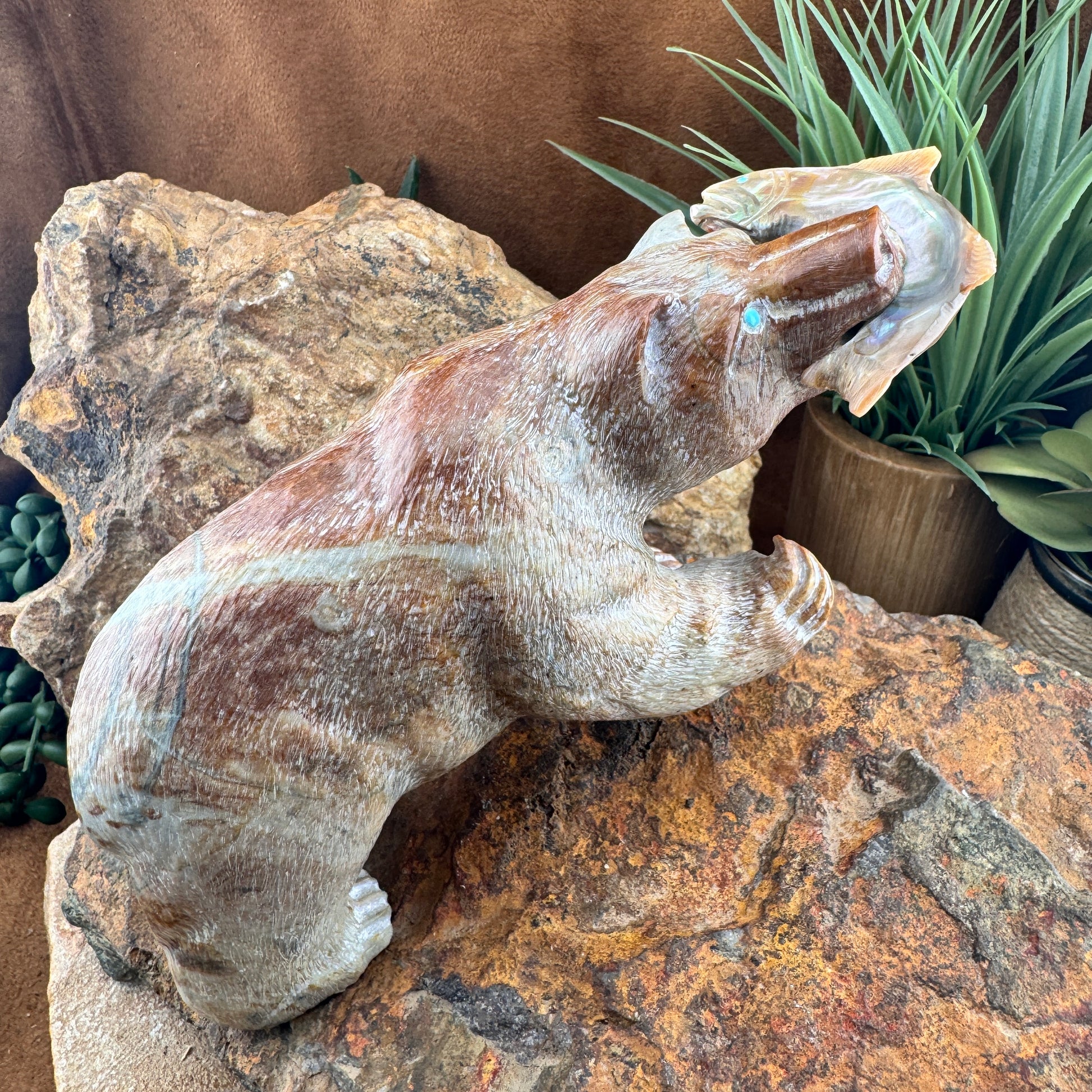 This remarkable Zuni fetish carving by Herb Him captures the raw strength and spirit of the bear in a moment of triumph. Hand-carved from richly veined stone in warm earth tones, the bear stands proudly with a Mother of Pearl fish held in its mouth, symbolizing abundance, perseverance, and gratitude. The fish’s iridescent finish contrasts beautifully with the bear’s natural texture, creating a lifelike scene that honors both predator and prey as sacred parts of nature’s balance. Finished with turquoise inlay eyes, this substantial carving reflects the artistry and storytelling deeply rooted in Zuni tradition.