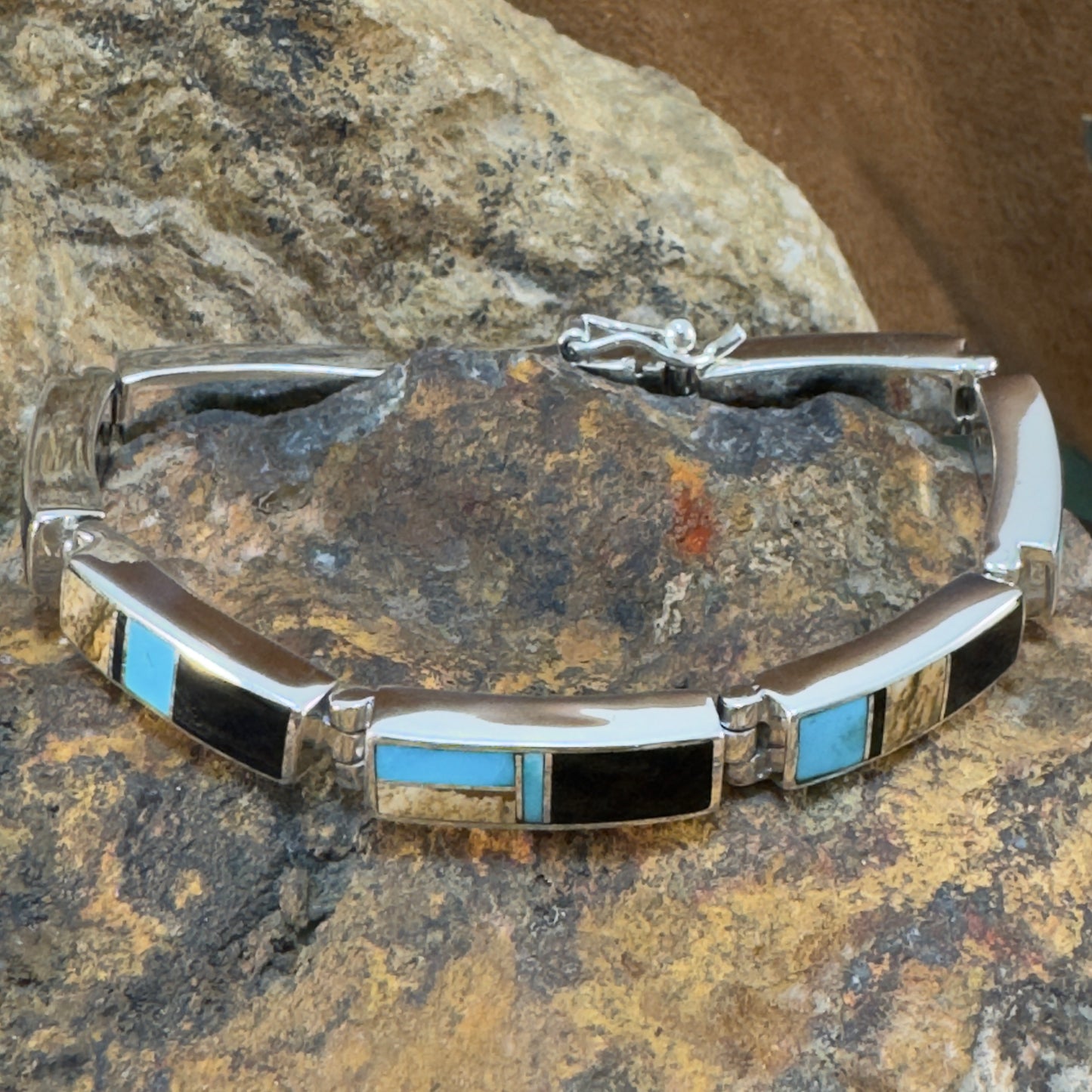 David Rosales Turquoise Creek Inlaid Sterling Silver Big Link Bracelet